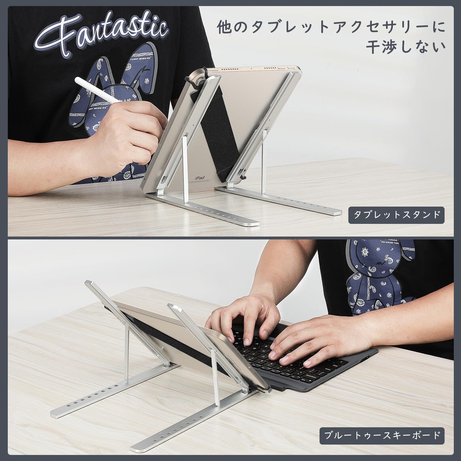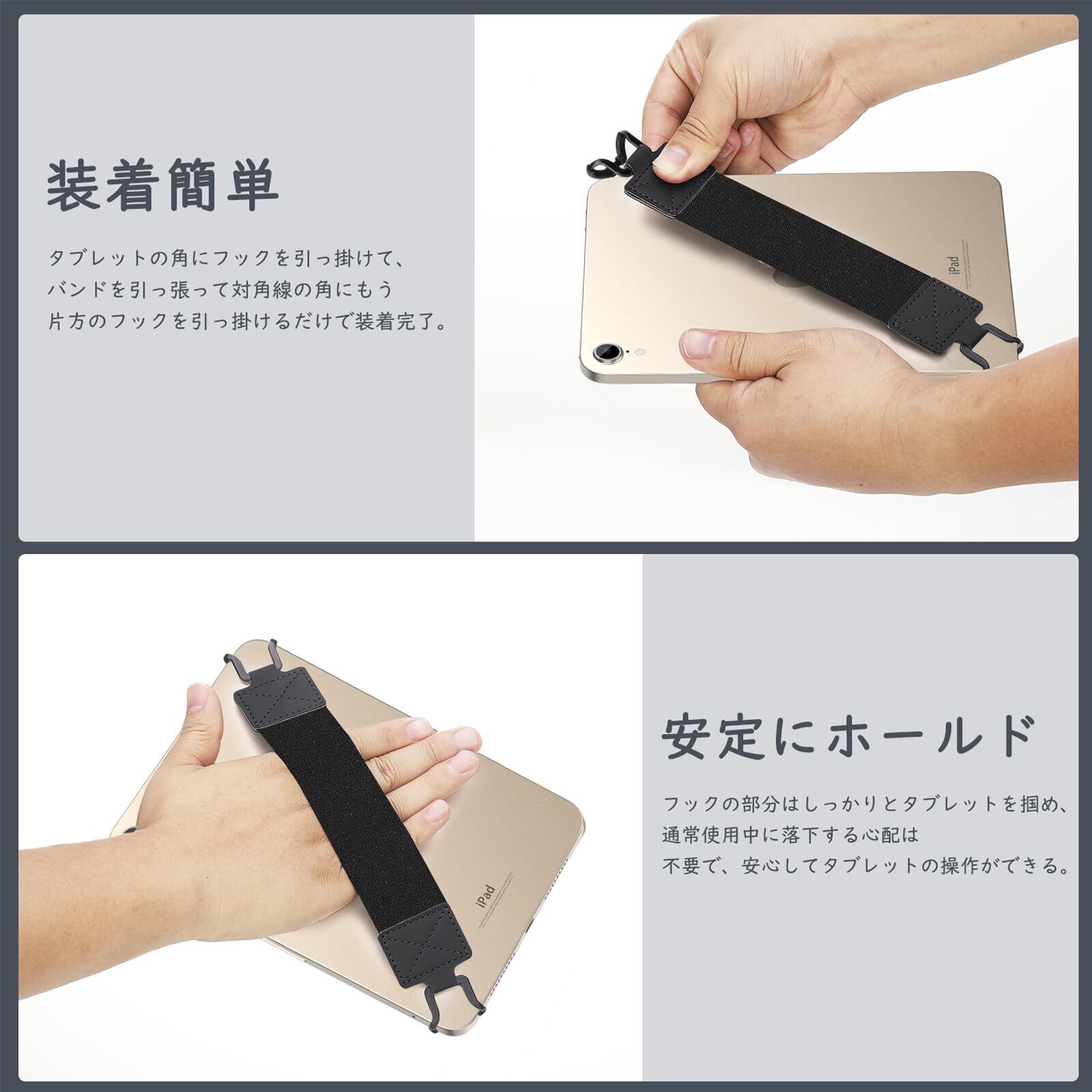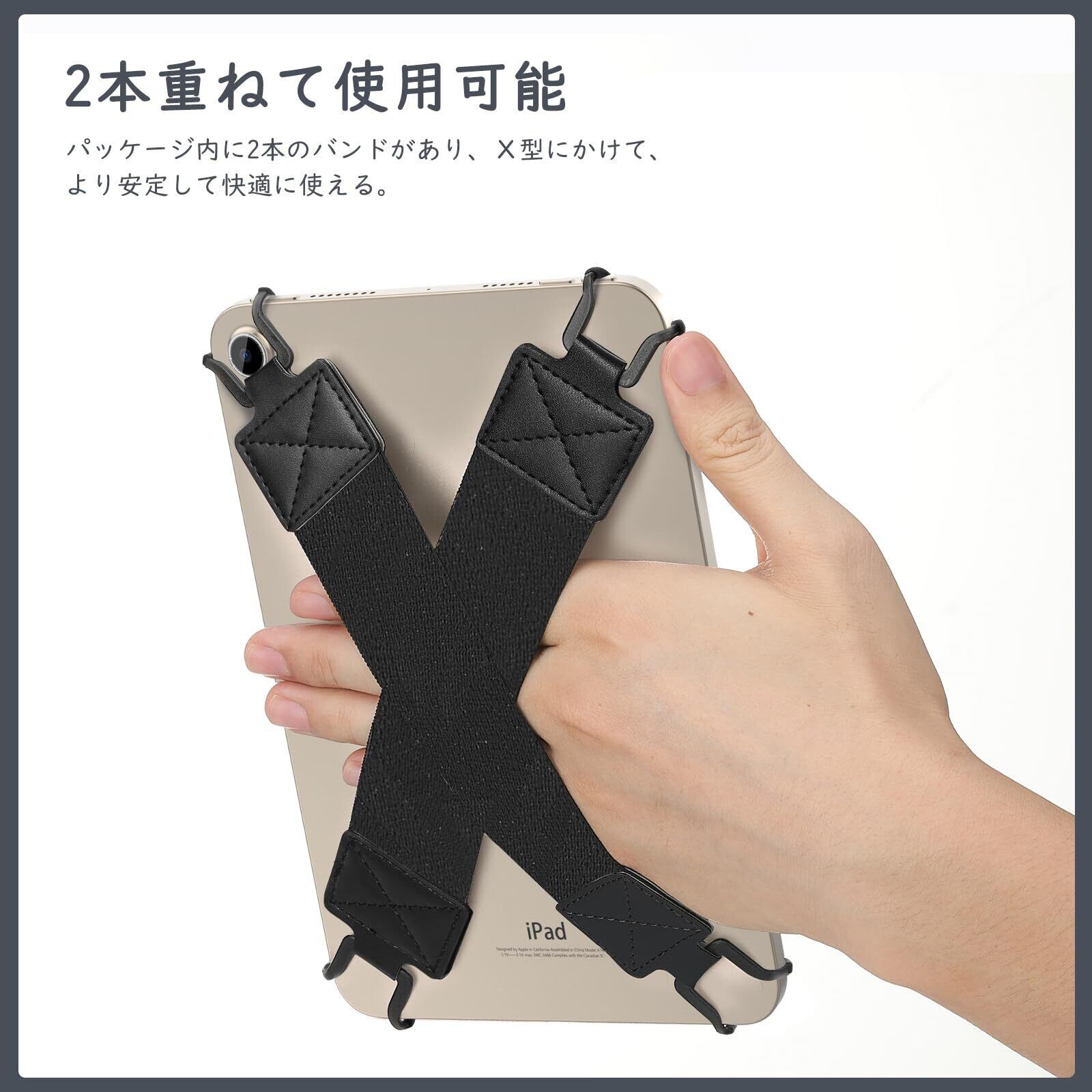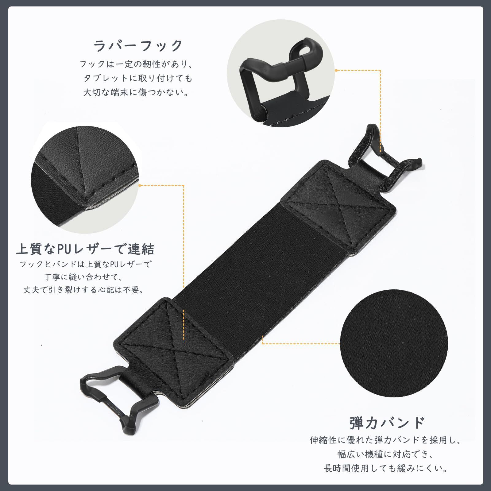 「伸縮性のいいバンド」 優れた伸縮性がある弾力バンドを採用し、幅広い機種に対応でき、長時間使用しても緩みにくいです。上質なPUレザーを使用してフックの部分と丁寧に縫い合わせて、丈夫で引き裂けする心配は不要です。フックの部分は一定の靭性があるラバー素材を採用し、タブレットに取り付けても大切な端末に傷つきません。