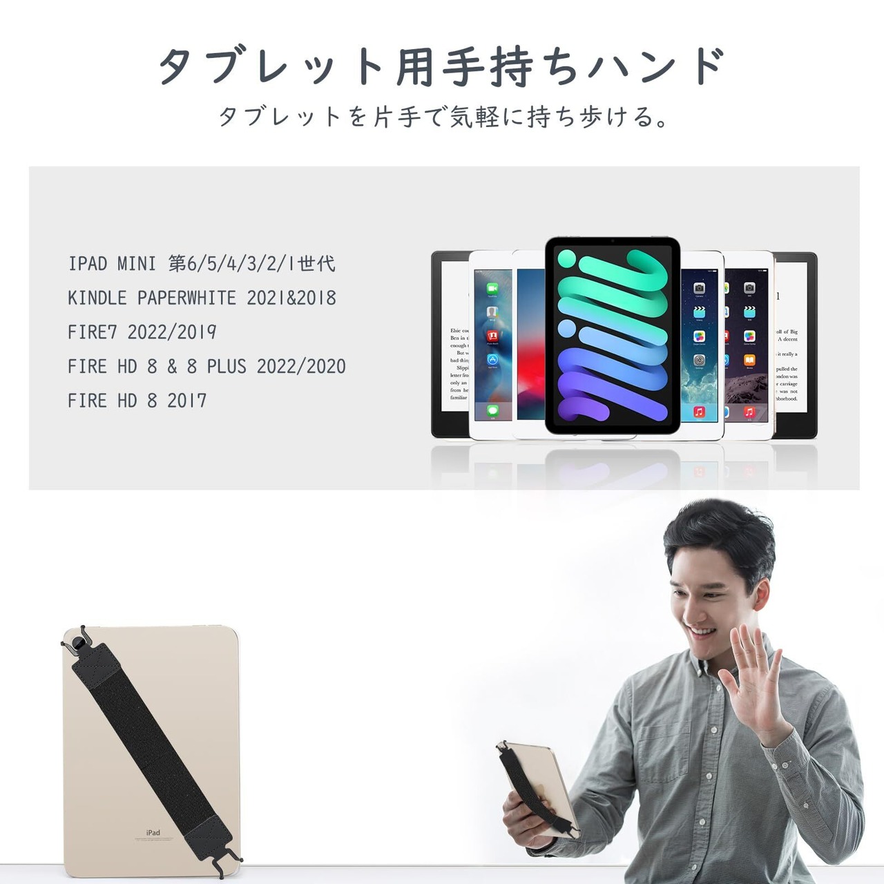 「対応機種」 両端のフック+弾力バンドが伸ばされていない状態下の全長は約17CMありますので、iPad Mini 第7/6/5/4/3/2/1世代、Kindle Paperwhite、Fire7、Fire HD 8 & 8 Plus、alldocube iPlay50 mini/iPlay50 mini Pro/iPlay50 mini Lite、Headwolf FPad3/FPad2/FPad1、TECLAST P80/P85T、Blackview Tab5/Tab60 など6~8インチまでのタブレットに適用します。お手元の端末の寸法を予めご確認の上ご購入ください。
