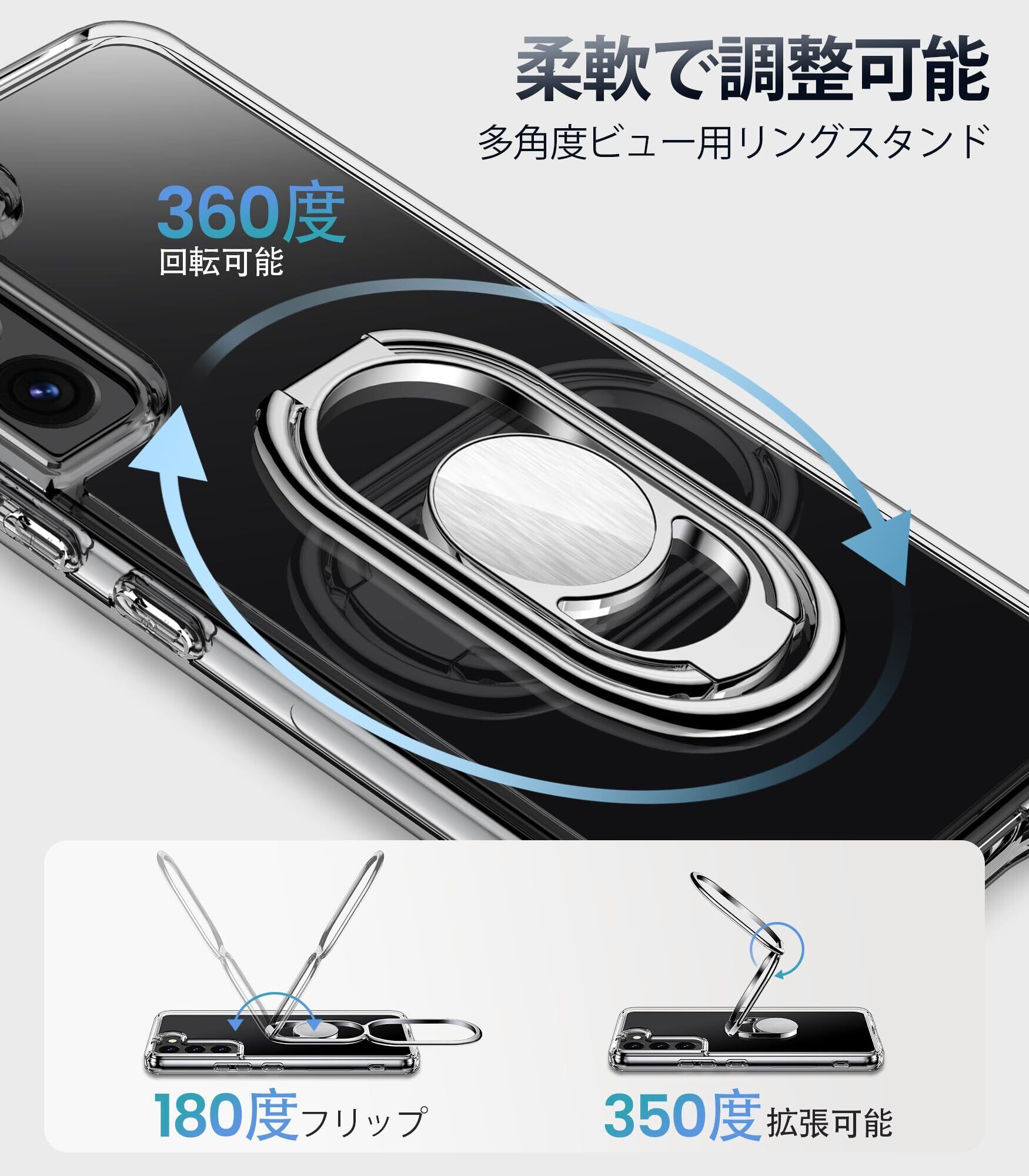 【自由に回転するリングスタンド】 このSamsung Galaxy S22のケースには、360°回転するベースと、それぞれ最大180°および350°まで調節可能な2つのアームが搭載されています。多彩なハンズフリー視聴オプションを提供します。
