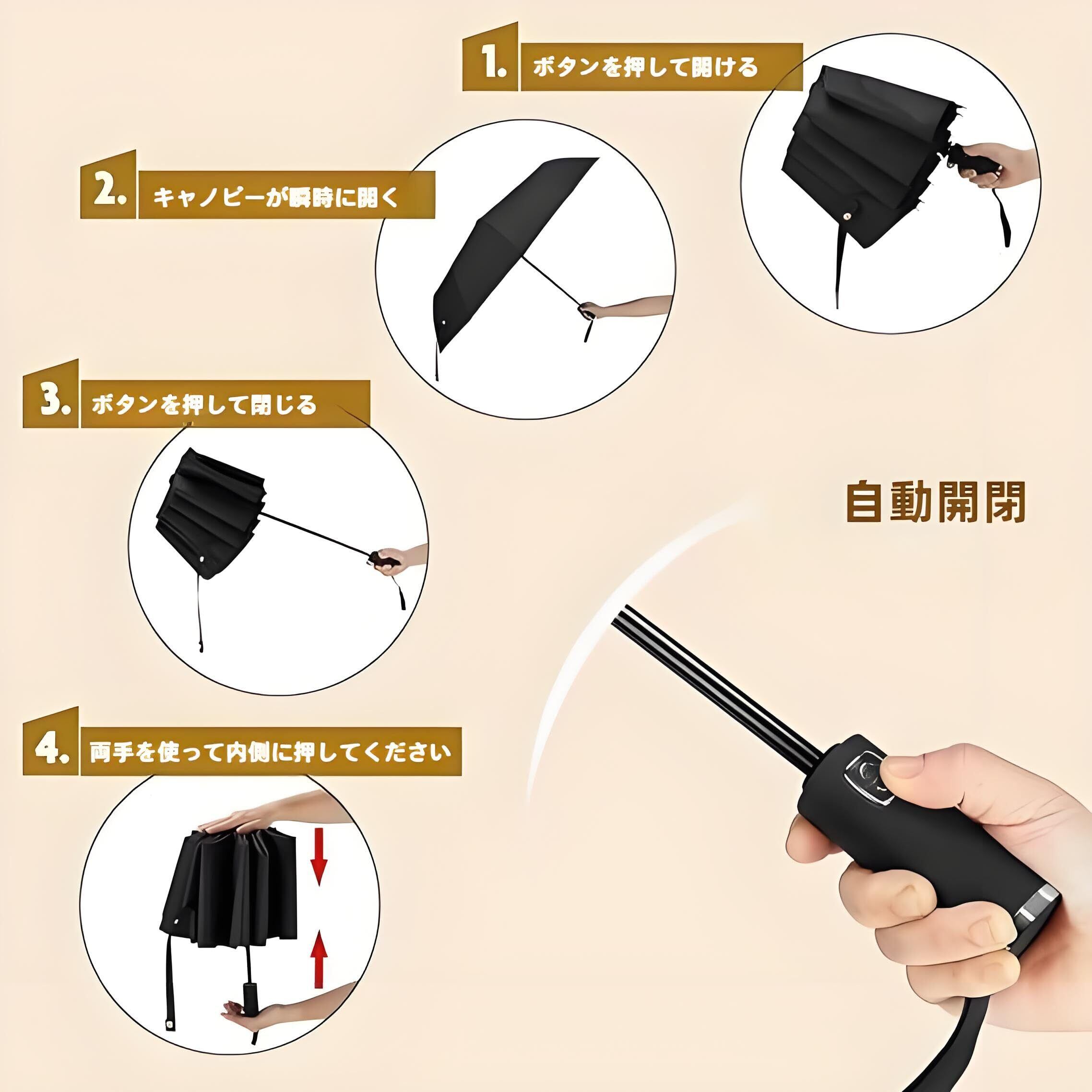 3. ワンタッチで自動開閉ができる日傘は、片手でも使え、とっさに傘を出して開ける際にはストレスがありません。車の乗り降りの際や、片手しかあいて無い時には大変便利です。荷物の多い時や雨の時でも、ボタンを押すだけでバッと開折りたたみ傘、便利に利用できます。車を降りたり、子供を抱いたり、荷物を持っている時、折り畳み傘は最適です。普通な通勤用カバンや車に常備しておけば、緊急天候にも対応できます。仕様の収納袋も付くので、持ち運びやすいです。電車内等の公共の場では人にご迷惑を掛けません。