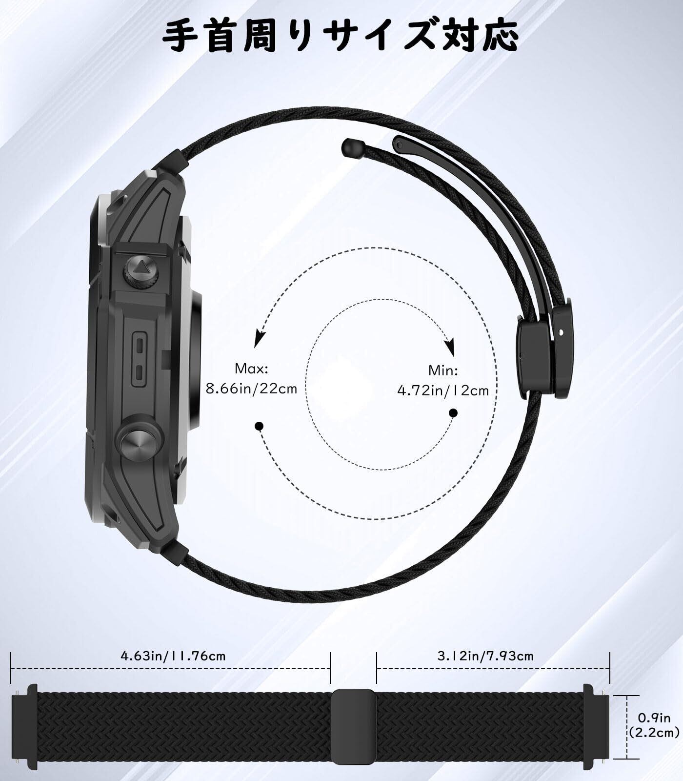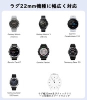 「ラグ22mm機種に幅広く対応」ラグ幅が22mmであり、ラグ取付仕様は画像表示と同じく、クイックリリース仕様のスマートウォッチに対応できる汎用のナイロン製取り替えベルトとなります。GalaxyWatch3(45mm)/Watch(46mm)、ガーミンForerunner(ForeAthlete)255/265/265 music/Venu3/2/Vivoactive4/VivomoveHRPremium/HuaweiWatch 3/Watch3Pro/GT4 46MM/GT Runner/Amazfit GTR 3/GTR 3pro/XiaomiWatch S1 Active/Watch S1/TicWatchGTW/TicWatch GTX/Fossil Gen 5 Carlyle/ASUSVivoWatch/LG W100などに適用できます。お使いの機種のウォッチ本体のラグ対応幅と取付仕様をしっかりとご確認されてからご購入ください。