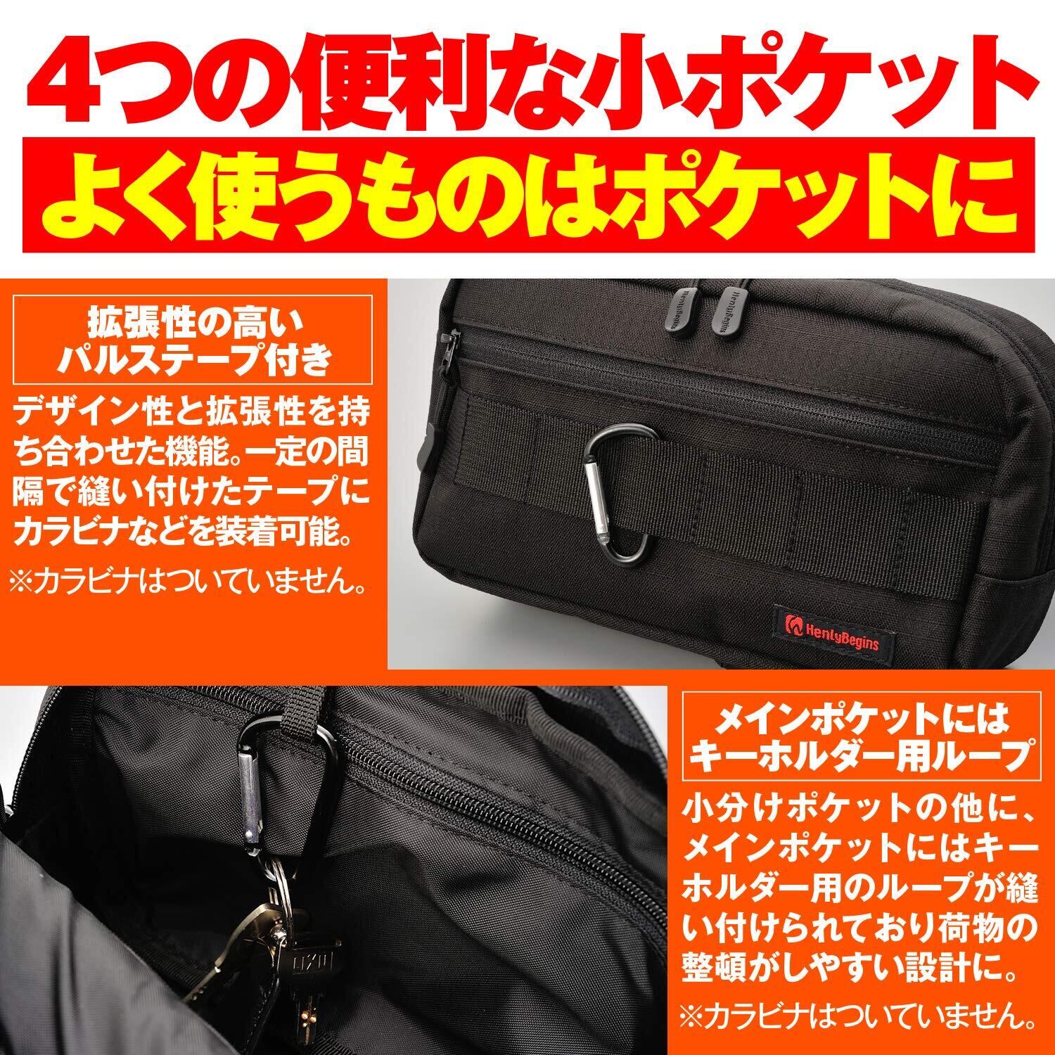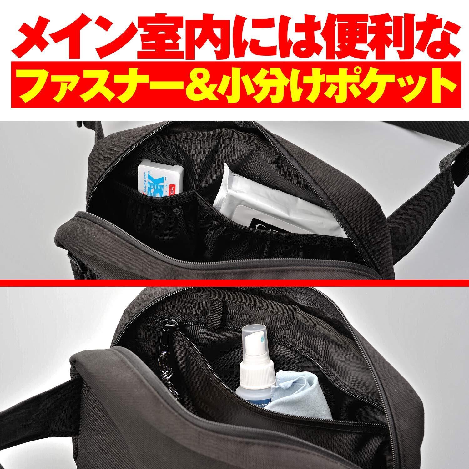 高い収納性:小分けポケット、ファスナーポケットが入ったメイン気室、サブ気室へ収納が可能
