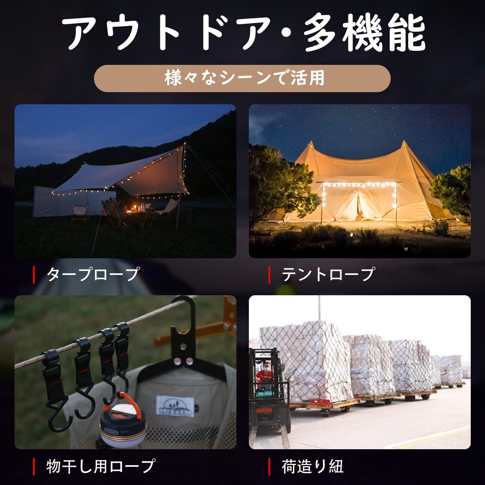 【便利性が抜群】:締め付けカム装置の助けを借りて、結び目のないロープ 締め付け器を片手で制御し、ロープを引くだけで締め付けまたは結合することができます。キャンプ先でテント/タープを固定する時、長さ調節できてしっかりロックできます、さらに固定ツールや吊り下げ金具としても使用可能で一石二鳥をできます