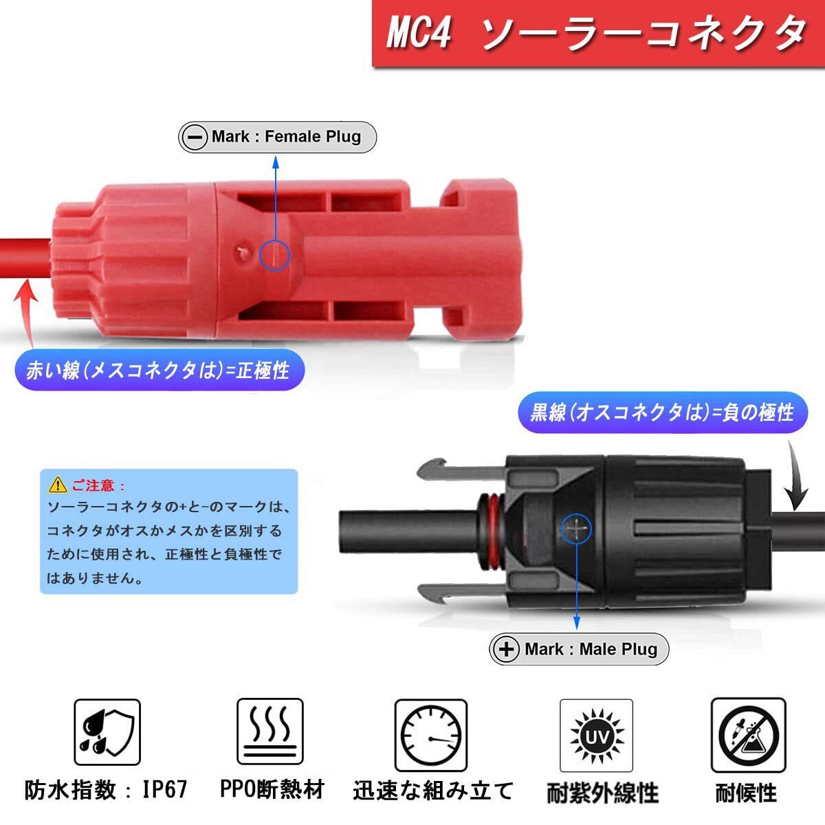 【ご注意】ソーラーパネルコネクタのブランドが異なれば、極性も異なる場合があります。 MC4と互換性のあるこのケーブルのメスコネクタはPOSITIVE、赤い線(MC4メスコネクタは)=正極性、 黒線(オスコネクタは)=負の極性。購入する前に、ソーラーパネルまたはソーラーバッテリーポータブル発電機の正極と負極を再確認してください。