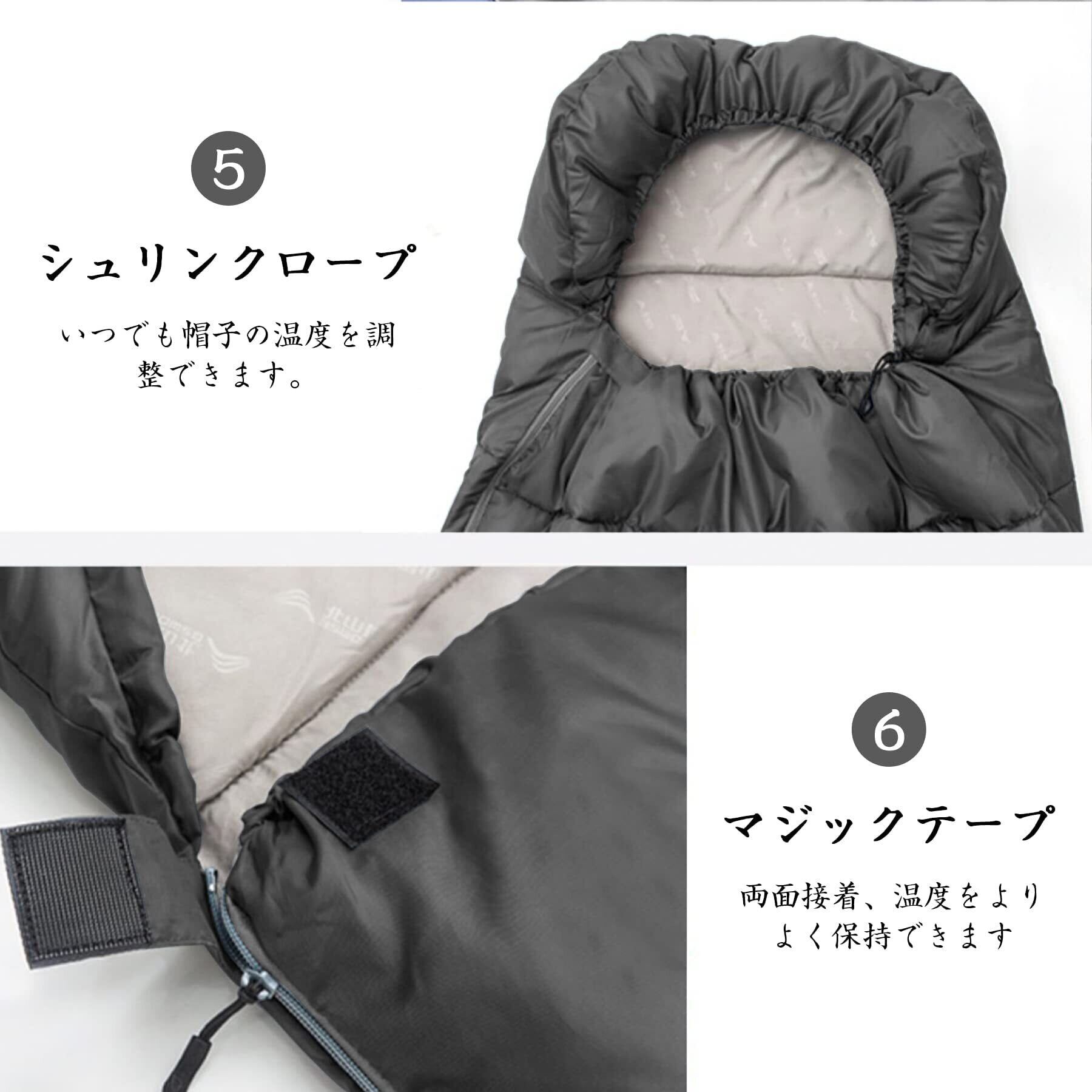 【実用のデザイン】帽子には手縄が伸縮できるので、頭部まで覆われて、襟元も閉めて、寒気を防いでちゃんと保温してくれます。右侧ダブルジッパーは内外側どちらからでも、足元から肩まで開閉でき、温度調節でも簡単、封筒型なので、厚着で就寝しても圧迫感なし。寝袋のポケットには、時計などの小物を収納できます。