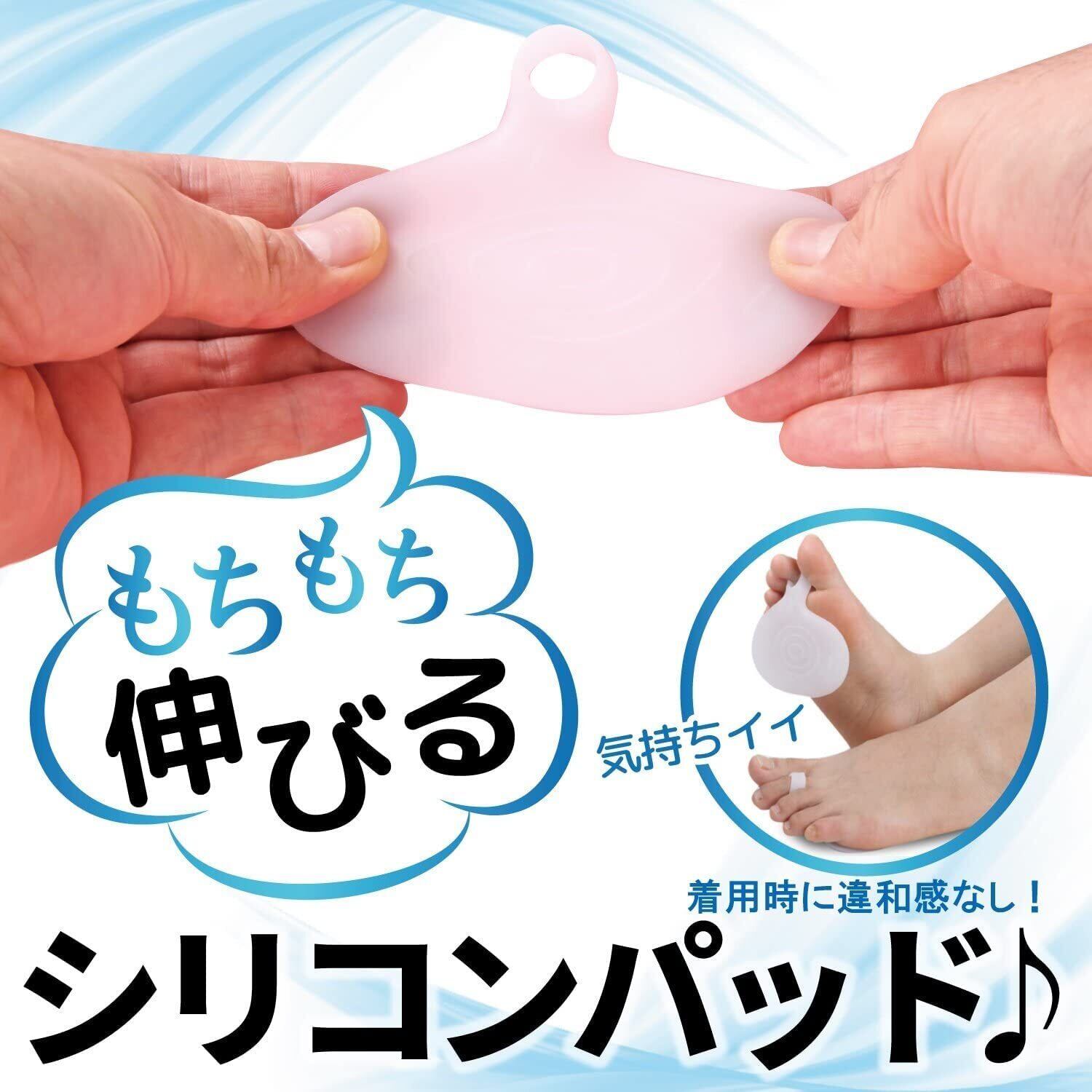 【簡単装着】装着はとっても簡単ラクラク足の第二指(人差し指)1本にはめて、足裏へ合わせるだけです。靴下やストッキングを上からはけば、さらにピッタリフィット。指に固定してあるので靴の中で滑りにくく、横ズレしにくいシリコンパッドです。肌触りも滑らかで抜群!柔らかで伸縮性抜群だから着用時に違和感がありません。