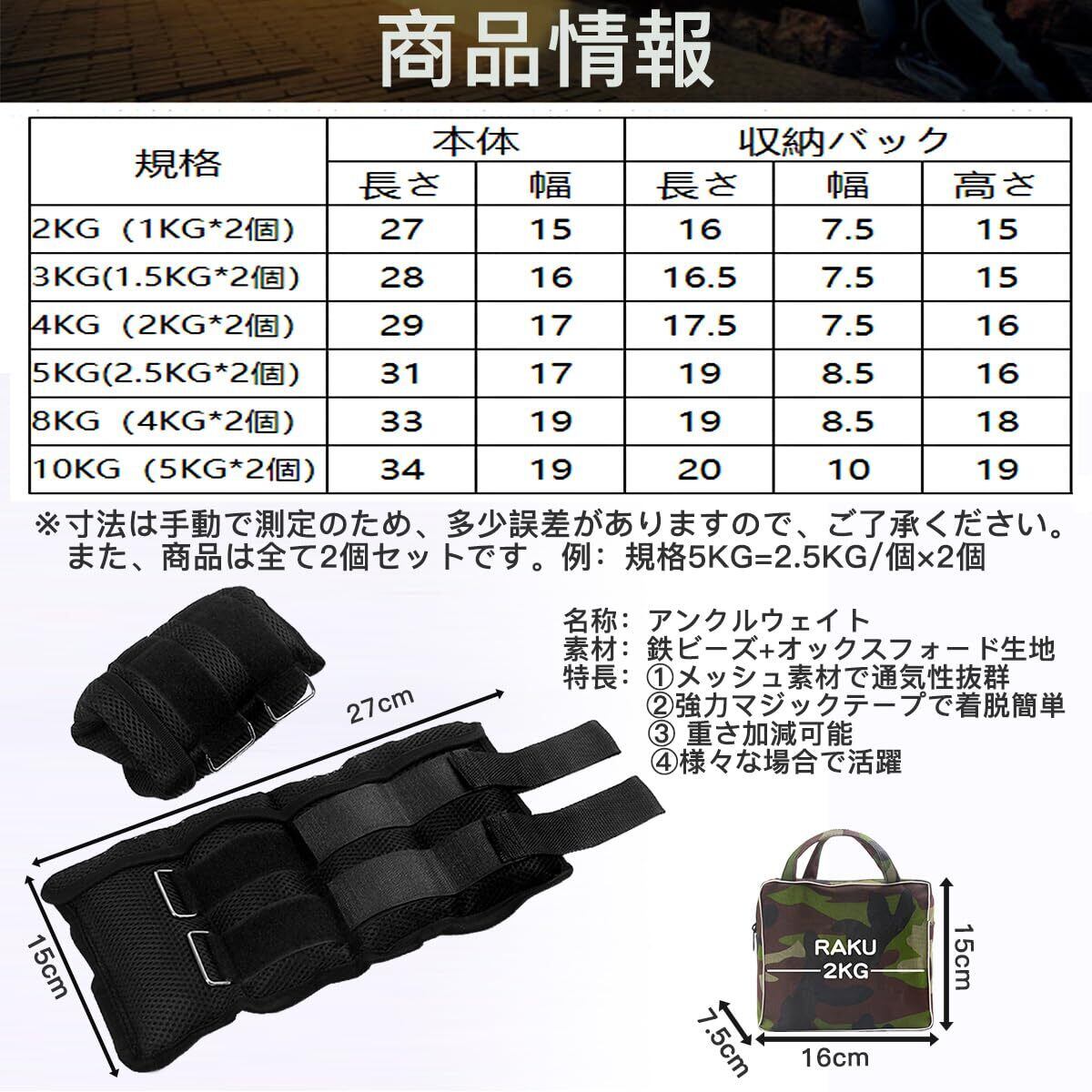 RAKU アンクルウェイト 重さ調整可能 5つ袋調節 2個入セット合計 2 kg 3 kg 4 kg 5 kg 8 kg 10 kg可選 筋トレ ウォーキング ダイエット エクササイズ 体幹トレーニング 通気性よい 耐久性手足両用 洗濯可 リストウェイト リスト (2キロセット)