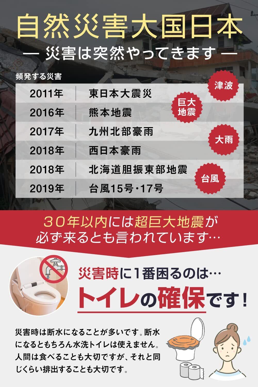 【充実の内容物、簡単取付け 防災 トイレ 】しっかり固める凝固剤・厚みのある排便袋・廃棄に役立つ処理袋・あったら安心のポケットティッシュ・備えに役立つ防災ブック。また、トイレに被せるだけなので、お子様やご年配の方にも使いやすく、ストレスなくお使いいただけます。災害用だけでなく、携帯トイレとしてトイレにすぐにいけない場合にも活躍します。介護の際にもお使い頂ける簡易トイレです。