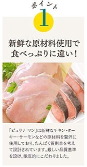原材料:フィッシュ(サーモン、ツナ)、チキンミール、コーングルテン、小麦、米、脱脂大豆、大麦、鶏脂(オメガ6脂肪酸源)、フィッシュミール、とうもろこし、小麦たんぱく、たんぱく加水分解物、可溶性繊維、魚油(オメガ3脂肪酸源)、酵母(βグルカン源)、 ミネラル類(カルシウム、リン、カリウム、ナトリウム、クロライド、マグネシウム、鉄、銅、マンガン、亜鉛、ヨウ素、セレン)、ビタミン類(A、D、E、K、B1、B2、パントテン酸、ナイアシン、B6、葉酸、ビオチン、B12、コリン、C)、アミノ酸類(メチオニン、タウリン)