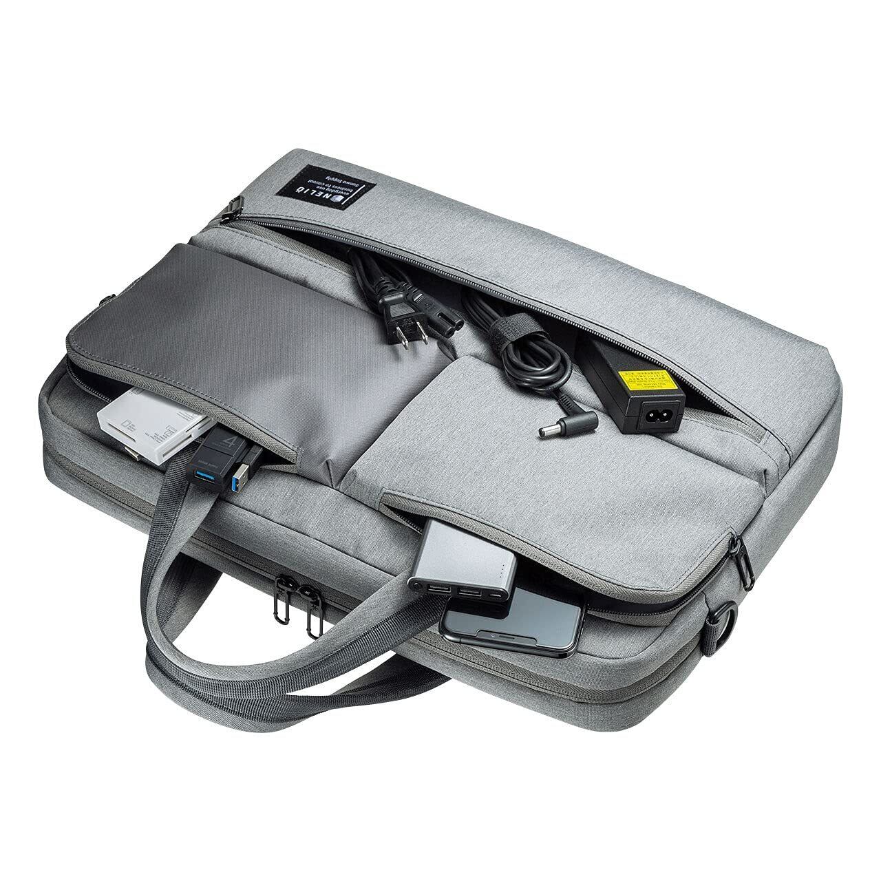 3つのフロントポケットが特徴の軽くて便利なカジュアルPCバッグ。15.6インチワイド対応・グレー。