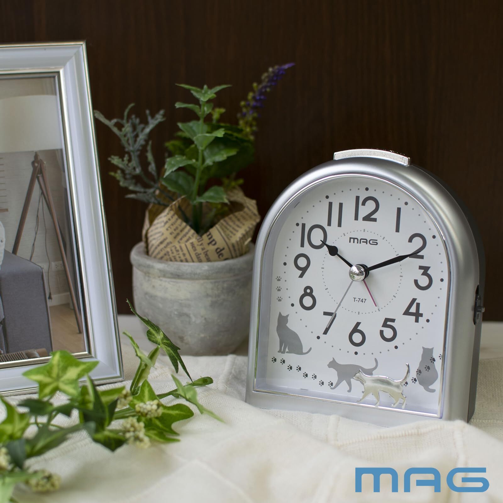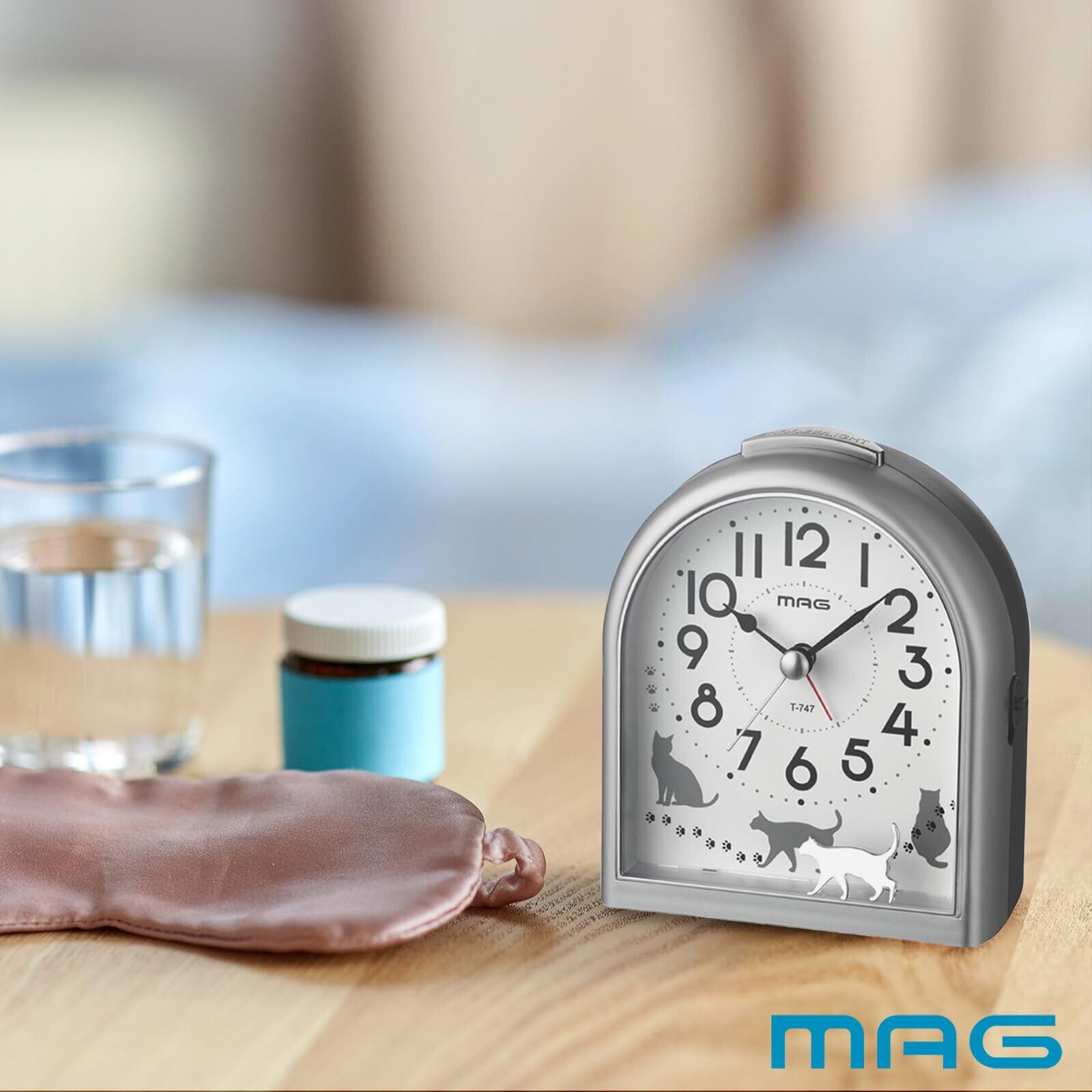 MAG(マグ) 目覚まし時計 置き時計 アナログ ねこ ネコ 動物 かわいい 子供 静音 連続秒針 電子音 アラーム スヌーズ ライト シルバー ミグレイト T-747 SM-Z ノア精密