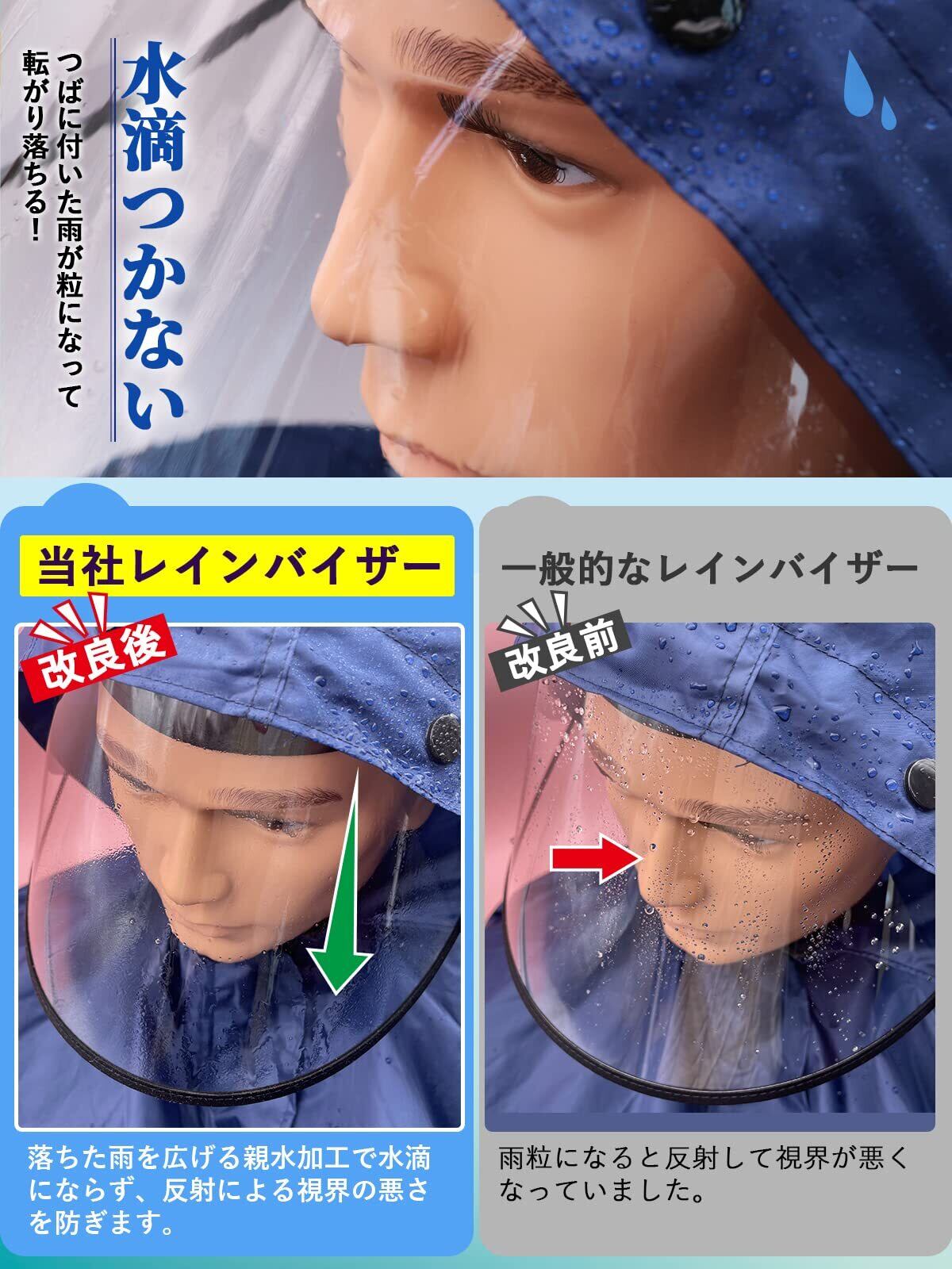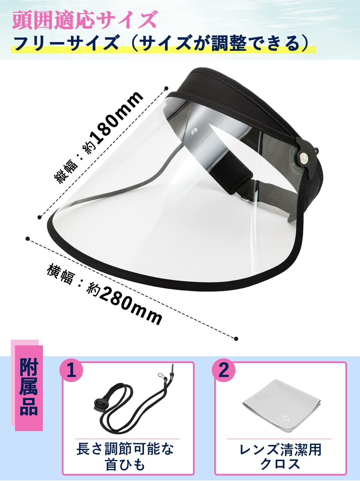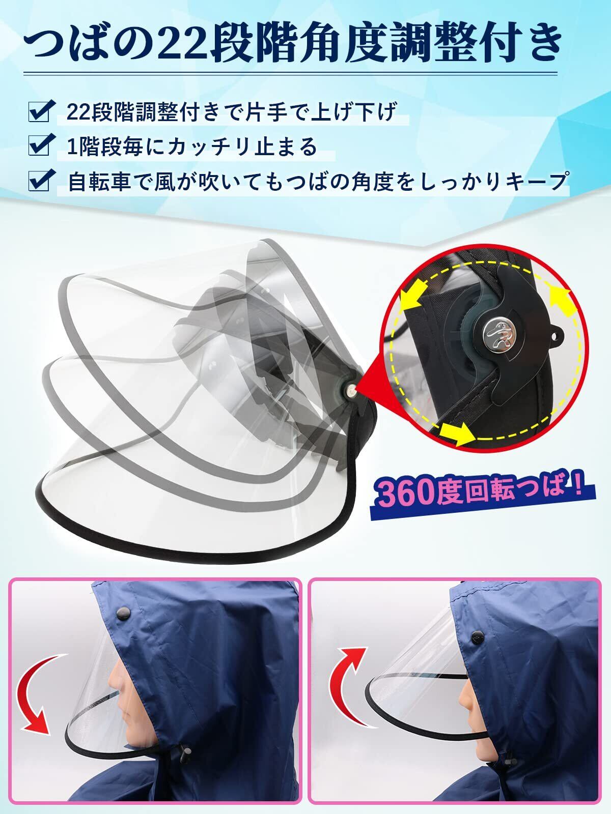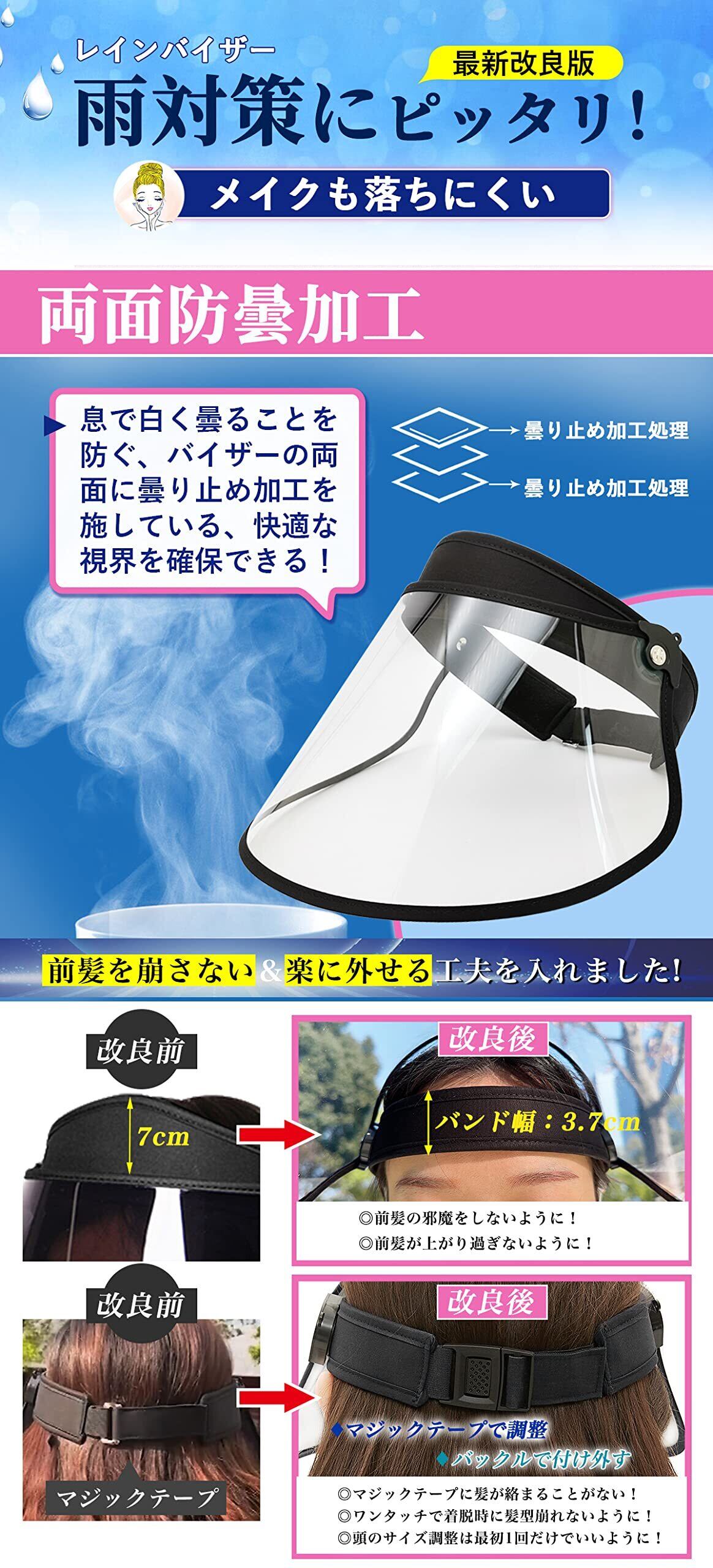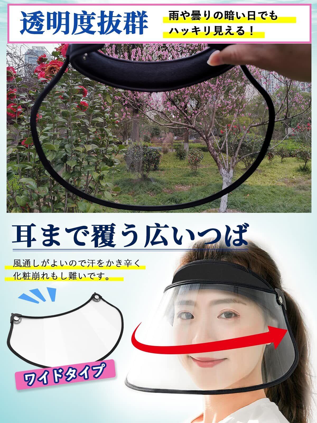 【22段階角度調整・広いつば】縦約18cm、横約28cmで顔全体が隠れる大きいサイズにしました。22段階調整付きで片手で上げ下げます。雨が直接顔にあたる事を防げます。バイザーのツバは上下の角度を大きく調節できるので、大きくて湾曲の少ないつばに付いた雨が粒になって転がり落ちるので、雨や風から顔全体をカバーできます。冬の寒さ避けにもなります。顔を守ることができますツバの角度を調節する際には、片手でバンドをしっかりもって行ってください。使わない時は上げられます。視界をさえぎらずにつば広タイプで、蒸れない、通気性が良いレインバイザーです。風通しがよいので汗をかき辛く化粧崩れもし難いです。