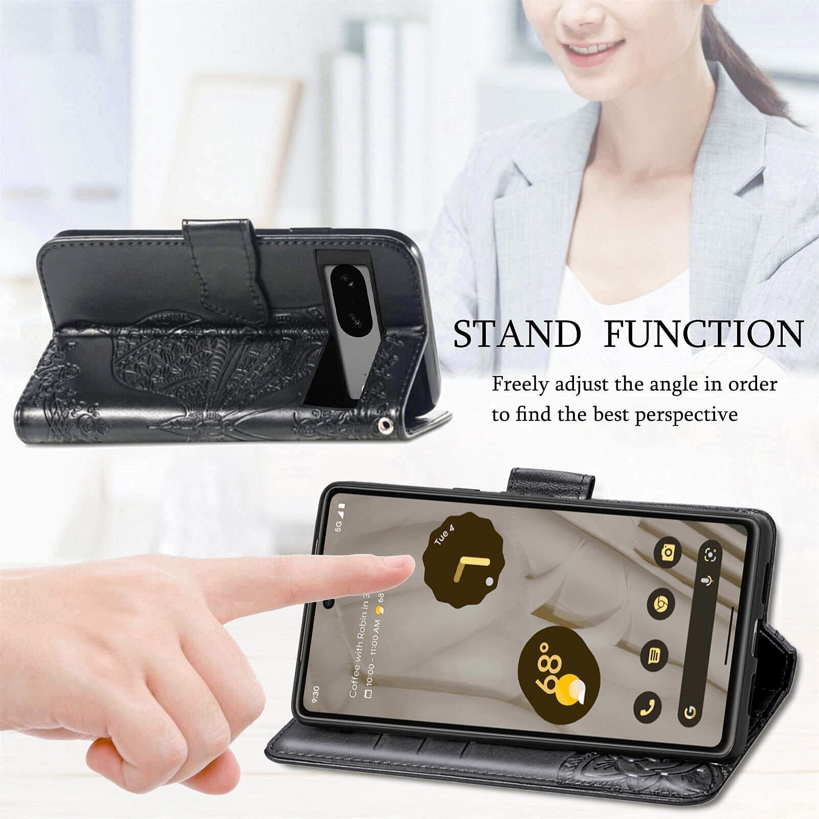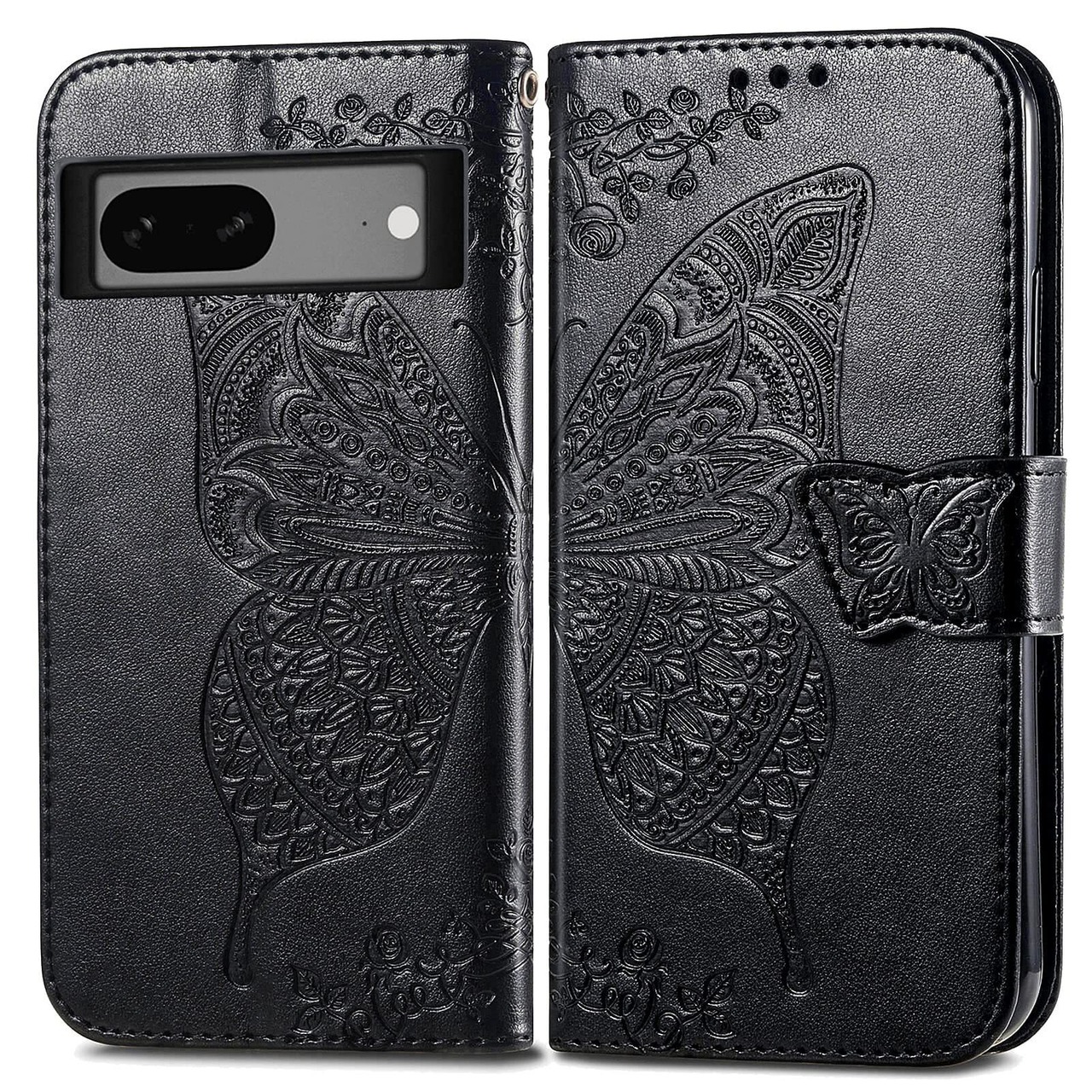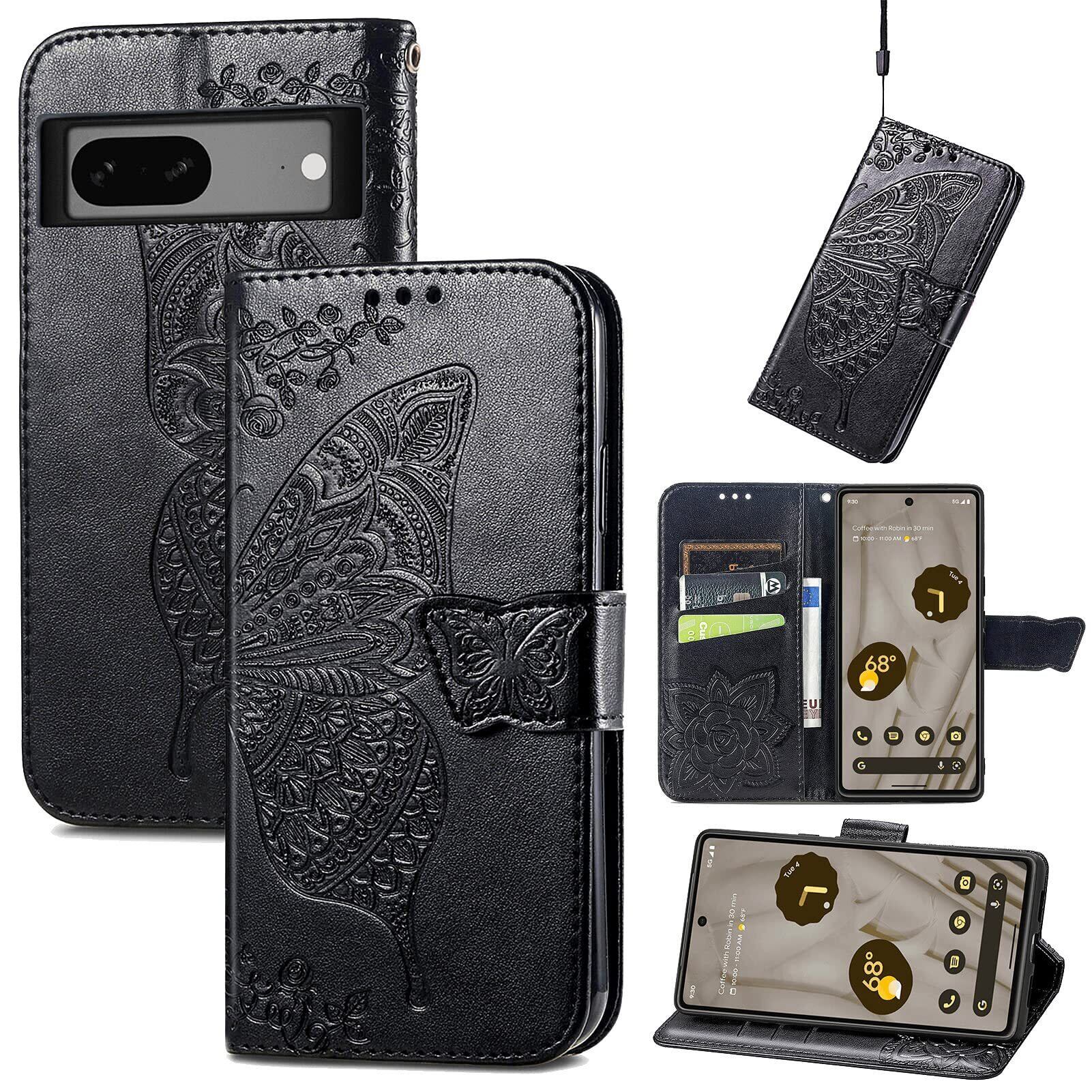 に適用するGoogle Pixel 7A ケース 手帳型 ピクセル7Aノートブック型携帯電話保護カバー多機能携帯電話ホルスター財布携帯電話ホルダーバンプパターンテクスチャ耐久性摩擦耐性携帯電話ケース男性と女性に適した多色オプション (バタフライ黒)