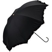 【上品なフリルが魅力!完全遮光100%生地を使用したフェミニンな長日傘】 ギャザーを寄せすぎず、上品で可愛いフリルが大人気の長日傘。 長時間外出する日にぴったりな、さっと開閉できる長傘タイプ。 レトロかつ華奢で繊細なデザインのハンドルは、先端のゴールドがワンポイントで、持つ人に女性らしい印象を与えます。