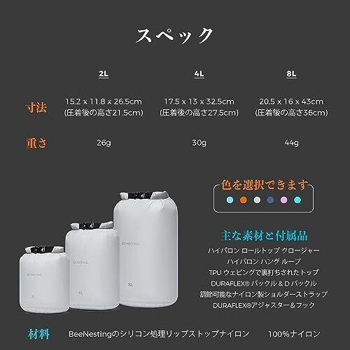 便利なギア - 2L/4L/8Lサイズ、2Lは軽食、旅行の必需品、手袋、帽子などに適しています;4Lはシェルジャケット、手袋、ビーニーなどに適しています;8Lドライバッグは、ダウン製寝袋、または替えの衣類の収納に適しています。