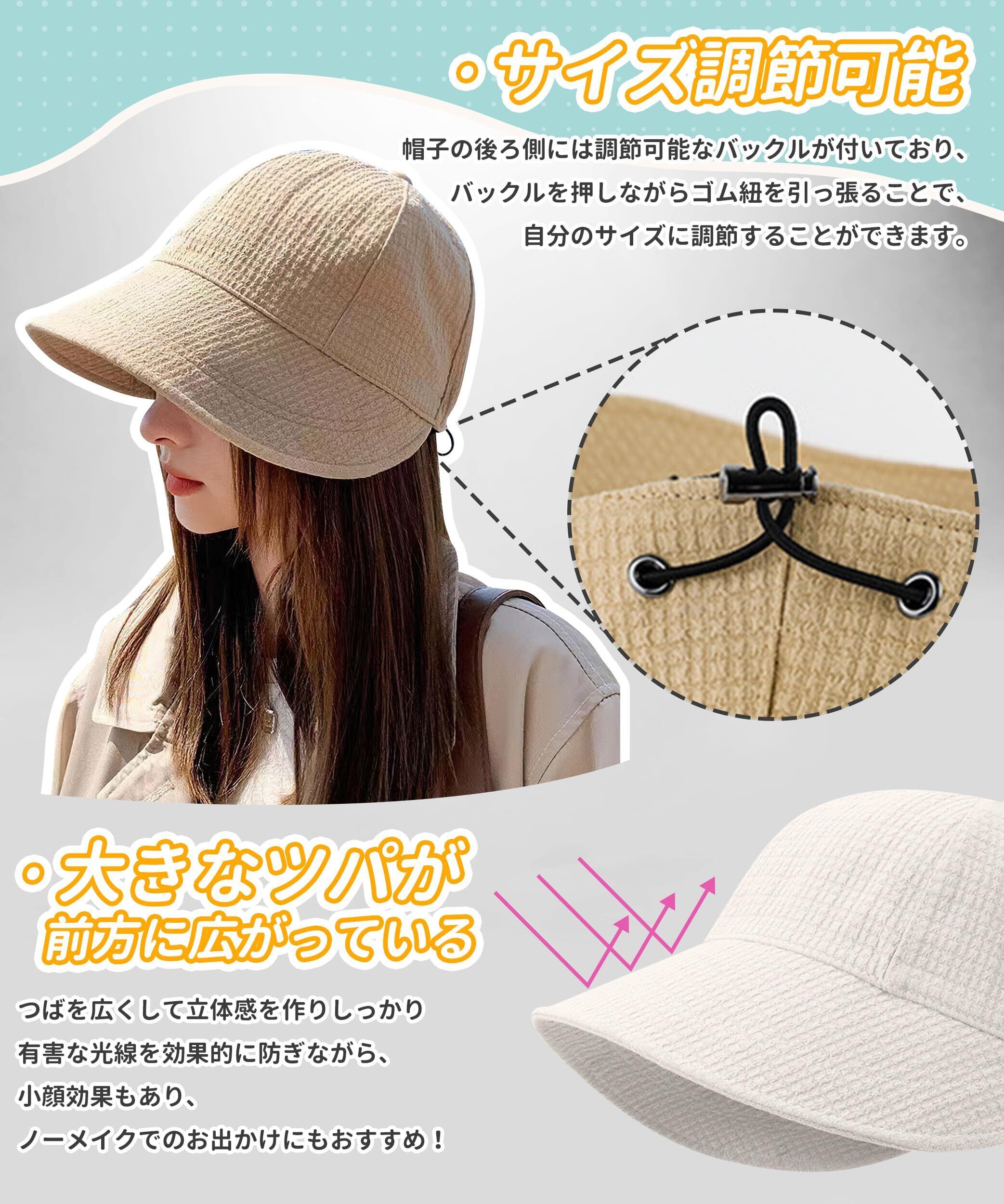 【簡単サイズ調整・吸汗排湿性優れ】頭回り:約55.0cm~60cm ツバ:約8.5cm 高さ:約15.4cm。このUVカット帽子は誰でも似合うように被りを少し深めに設計し、しっかり深くかぶれるかぶり心地。帽子の後ろにアジャスターがついているので、サイズ調整は自由自在、大部分の大人の頭の周りに適しています。約5センチの微調整が可能なので、お好みのサイズ感でかぶることが出来ます。UVカット帽子内側の層が吸汗排湿の良い素材でできており、吸汗速乾性高いので、長時間着用しても快適です。