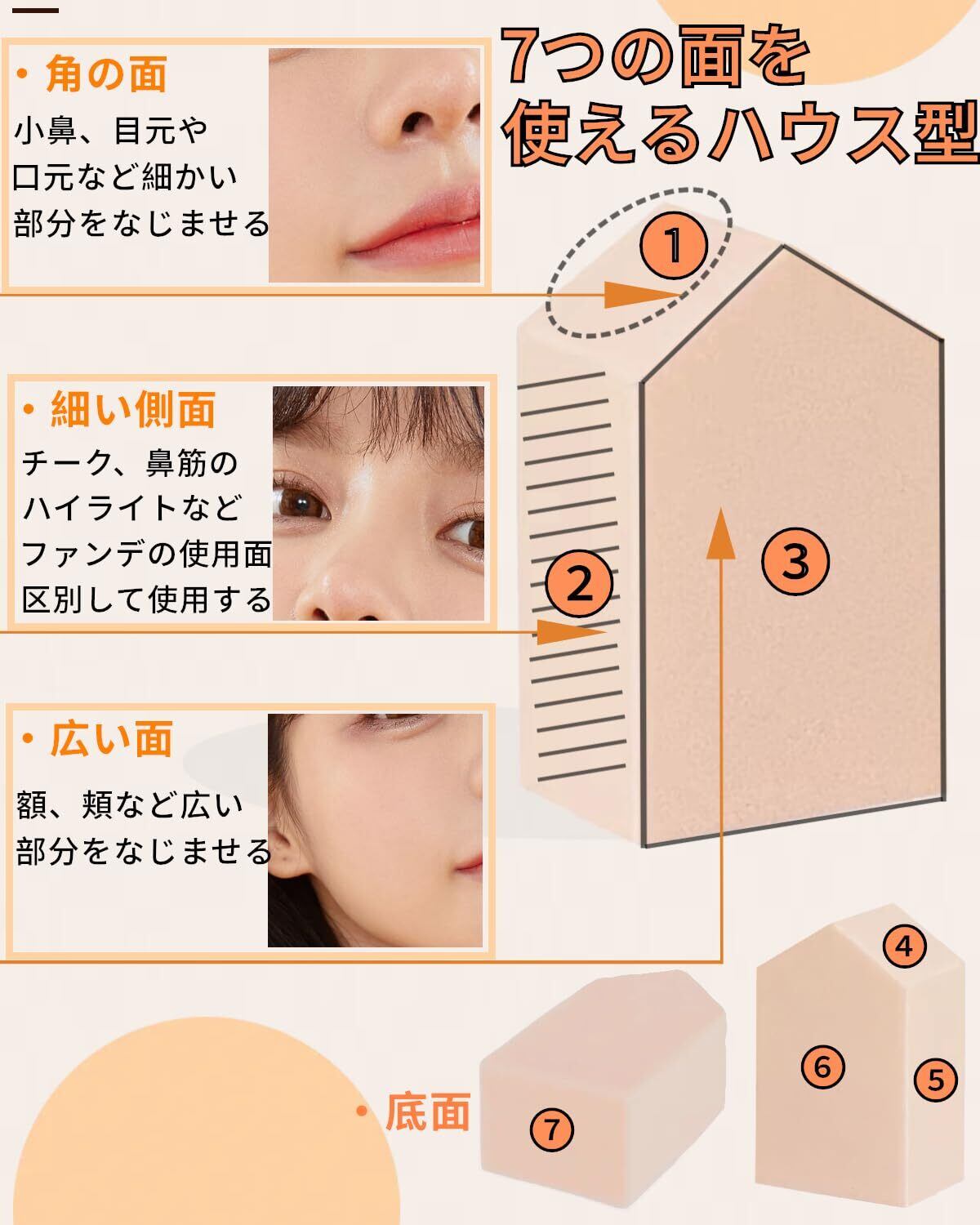 【七つの面と角両立して使い分けるハウス型】ハウス型のスポンジメークには平面と角を使い分けながら、頬・額など広いパーツから小鼻・目元・口元など細かい部位までキレイにファンデをなじませます。