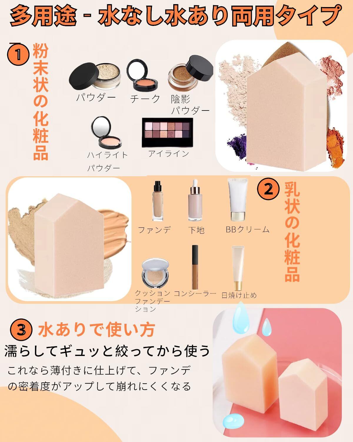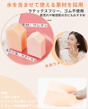 【水あり水なし両用タイプ】水なしで使うのはスポンジで乾いたままにファンデ・パウダーなどを肌に使用可能です。水ありで使うのはスポンジを濡らしてギュッと絞ってから使うものです。これなら薄付きに仕上げて、ファンデの密着度がアップして崩れにくくなります。