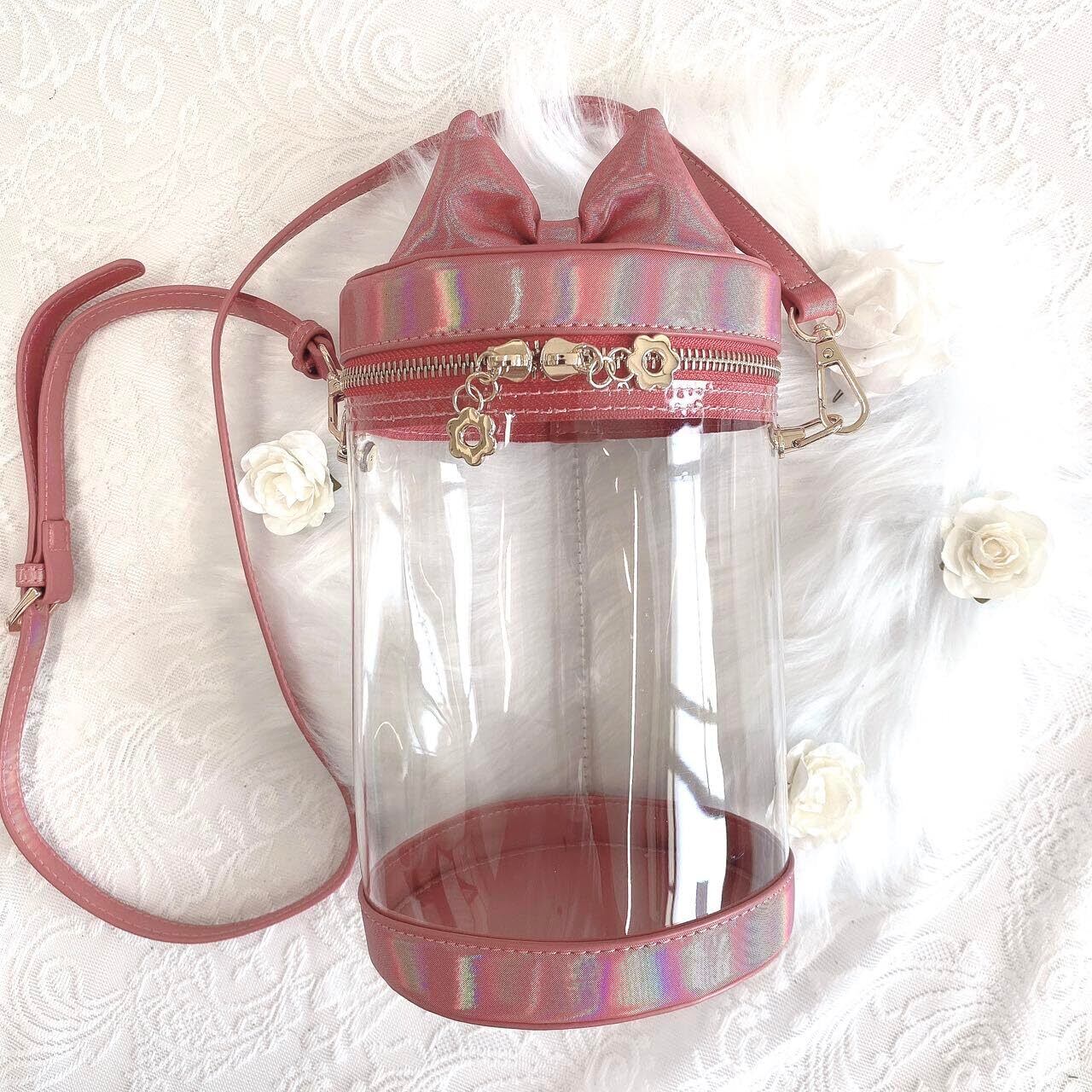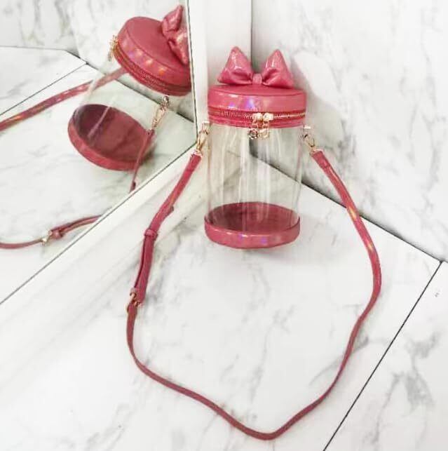 ジートリガー(G triger) 猫耳風リボン付きぬいバッグ ぬいポーチ 収納 見せバッグ ショルダーバッグ イベント クリア 透明 円筒 赤 レッド W13.5cm×H21cm オタ活 ぬい活