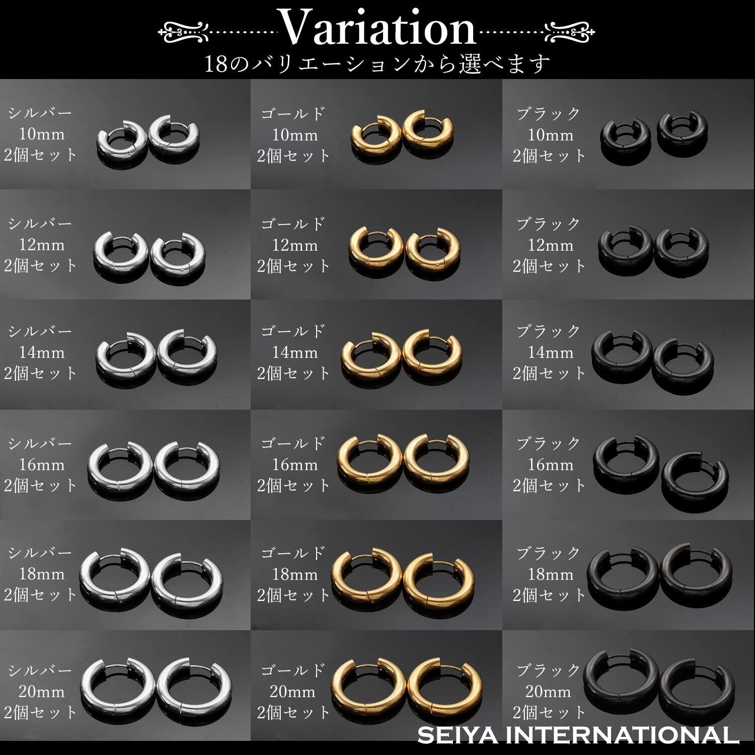 【 選べるカラー・サイズ 】フープピアスサイズは内径10mm・12mm・14mm・16mm・18mm・20mm。カラーはシルバー・ゴールド・ブラックの3色をご用意しました。ピアスゲージは一般的な18G(約1.0mm)になります。フープピアスのサイズはわっかの直径が大きいほど存在感があり、カジュアルな印象を与えます。シンプルなコーディネートに華やかな雰囲気を加えたい時は、直径の大きなフープピアスがおすすめです。一方、わっかの直径が小さいほど上品で落ち着いた印象になります。シックにまとめたい時やビジネススタイルに合わせる時には直径が小さなフープピアスがおすすめです。