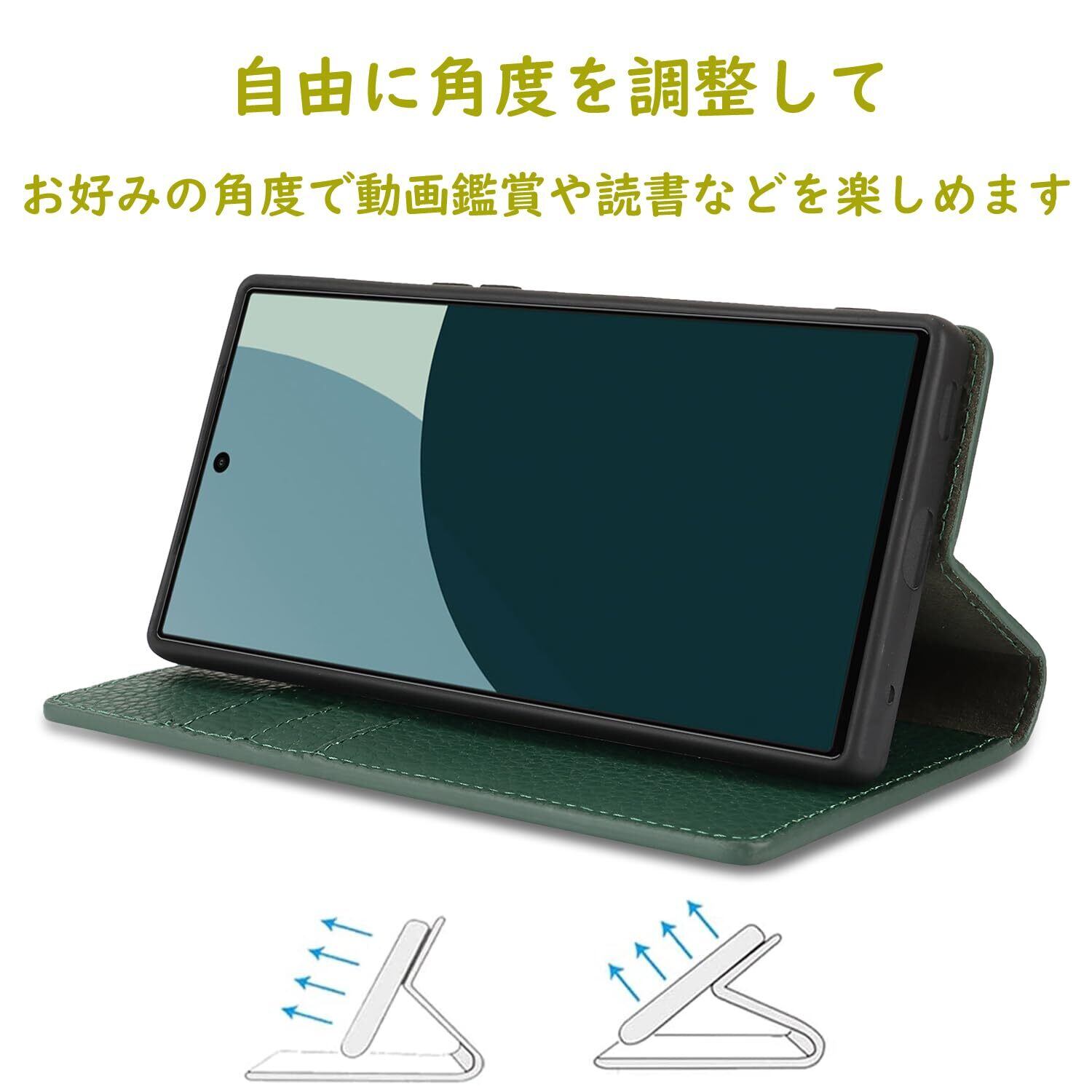 【収納】ケース内側に実用性のカード入れポケット×3、内側ポケット×1、カード類、現金、名刺、免許証入れなどを収納でき、通勤も通学にも楽々タイプです。カードスロットに2枚のカードを入れると、内蔵マグネットの機能を最大限に発揮し、カードが消磁されるのを防ぐことができます。横置きスタンド機能が付きまして、好きな角度を調節です。映画を見たり読んだりすることで手を解放できます。