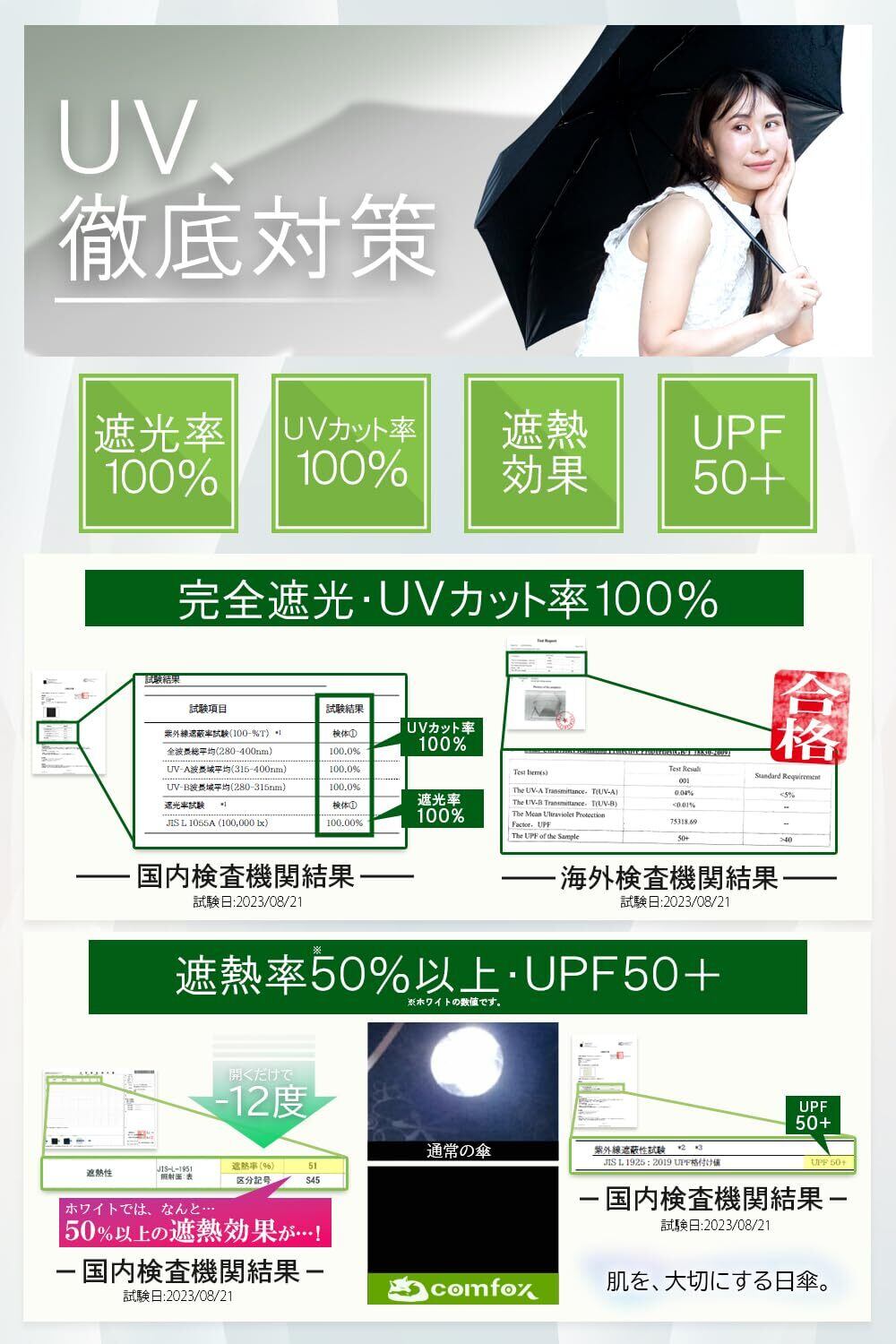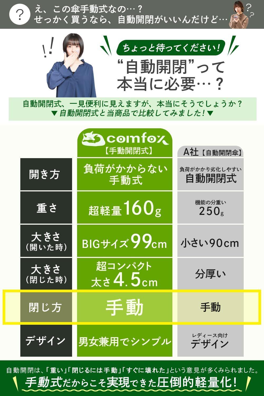 【 プレゼント 贈り物 としても選ばれております!】誕生日、母の日、父の日、などの プレゼント ギフト に是非岡山県メーカーcomfoxがプロデュースした折り畳み日傘をご活用ください! 【comfoxは商標登録済(登録6689599)の「岡山県ショップ comfox 」オリジナル商品です】類似品(デザイン、カラー)にご注意ください。 【当店は、少人数で運営している地方のECショップです】少人数だからこそできることがあります!どんな些細な事でもお気軽にお伝えくださいませ!誠心誠意対応させていただきます! ※検査機関詳細国内2機関(紫外線技術センター/ 証明番号DTTR2023082103-2,102-2,101-2/試験日5.8.21)(ボーケン品質評価機構/証明No.25023003262-1/試験日5.8.21)海外機関(SHENZHEN NANZHIFU INDUSTRIAL/レポートNo.A2230395284101/試験日5.8.11)