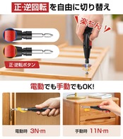 【初心者に最適!電動・手動兼用・最新強化版】 この電動ドライバーは、DIYや家具の組み立てなど、作業効率を格段にアップさせる人気アイテムです。ボタン一つでネジの締め付けや緩めが簡単にでき、女性、お年寄り、子供でも使いこなせます。全銅モーターを搭載し、強力なパワーと長寿命を実現。指一本で正回転・逆回転を自由に切り替えられ、電動時の最大トルクは3N・m、手動時は10N・mです。電動である程度ネジを締めた後、手動で微調整できるため、適切なトルクで確実に作業を完了できます。滑り止めボールグリップを採用し、握りやすく、滑りにくい設計で、締め付け作業が快適です。