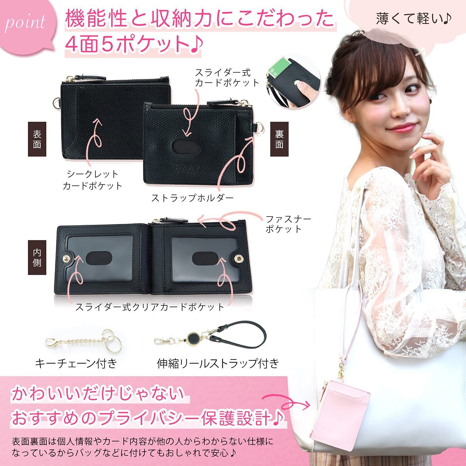 【 4面5ポケットで個人情報もしっかりガード 】 カードは4面にそれぞれ収納可能。表面・裏面はカード内容が人から覗かれないプライバシー保護設計タイプ。 無意識に持ち歩いている時やトートバッグなどカバンに付けても安心。内面の2つのポケットはスライド式のクリアポケットになっているので 免許証や社員証などを入れるのにも適しています。またマチ付きファスナーポケットに入り切らないカードを入れることも可能です!