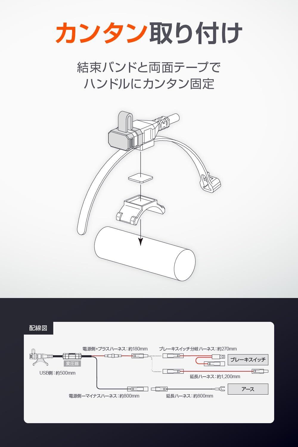 【仕様2】ブレーキスイッチに接続するだけの簡単接続。メインキー連動だから、バッテリーあがりの原因となる待機電流消費がありません。
