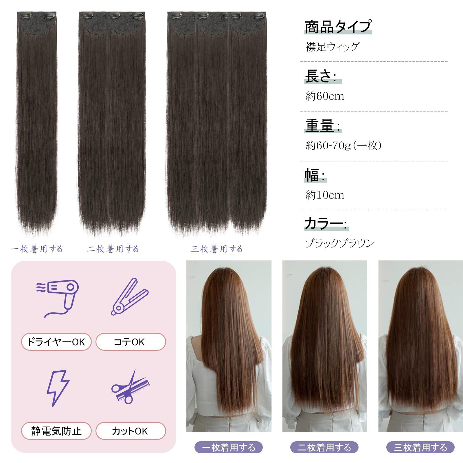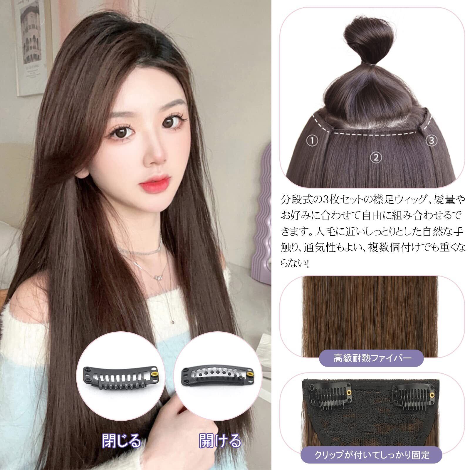 FESHFEN 襟足ウィッグ 3枚セット ロング ストレート エクステ ワンタッチエクステ 襟足エクステ ワンタッチ ポイントウィッグ エクステンション ウィッグ ハーフウィッグ つけ毛 付け毛 日常 ファッション 耐熱 クリップ付け 60cm ブラックブラウン