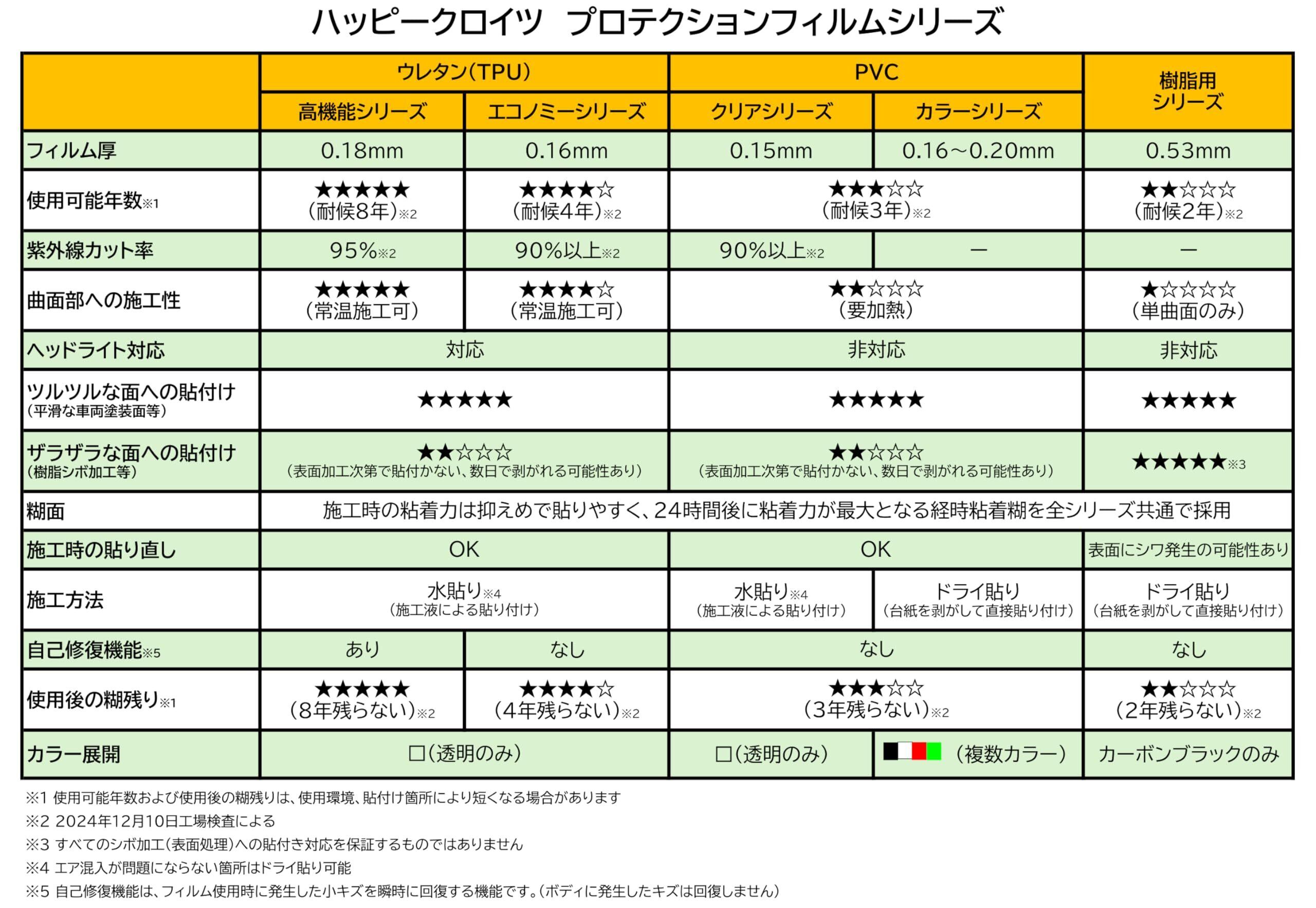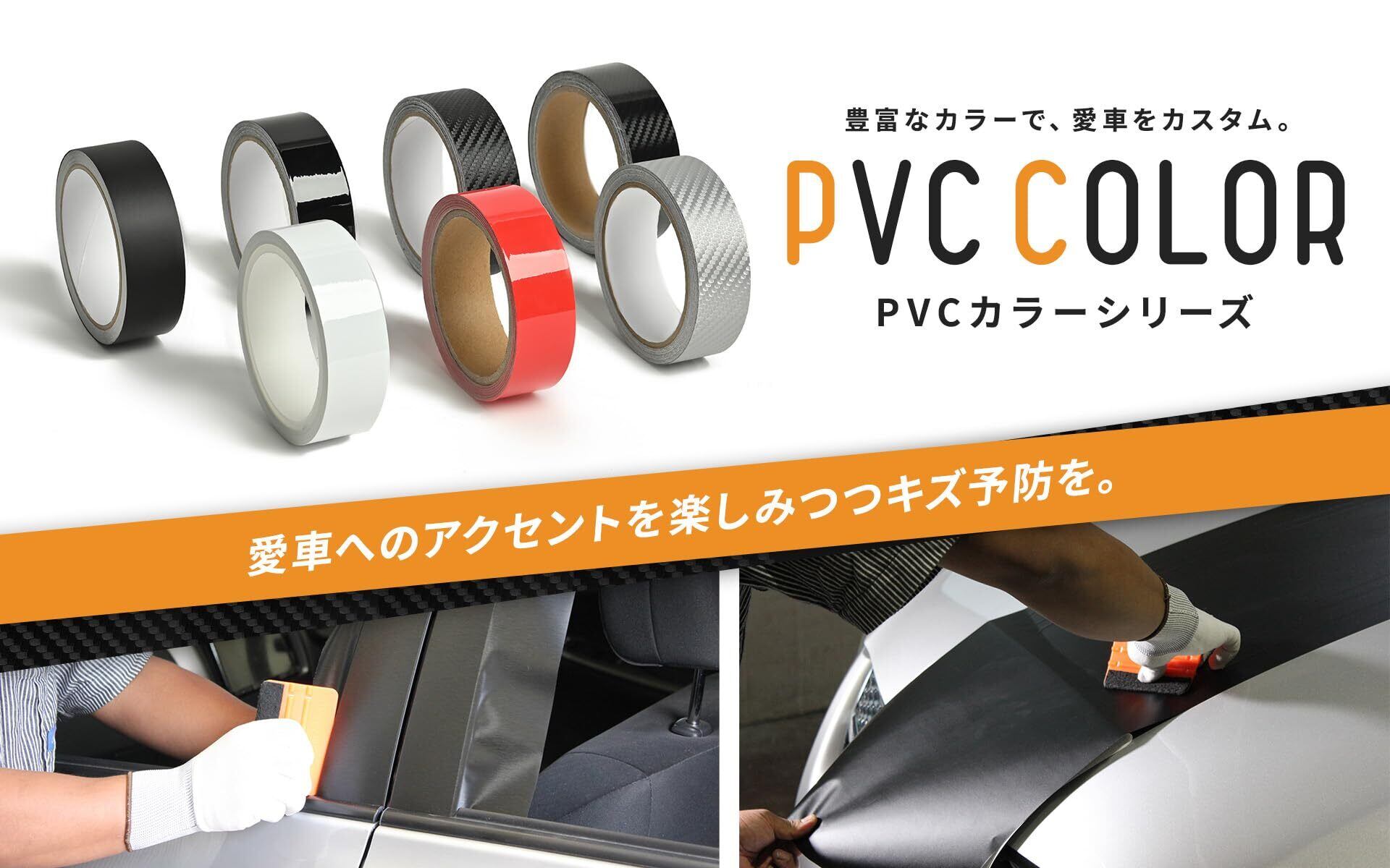 カラータイプは台紙を剥がして直接貼り付けるだけの簡単施工で、カラーアクセントとキズ保護を同時に実現します。カーラッピング専用フィルムとして開発されており、耐候3年、使用後に糊残りのない仕様で設計されております。