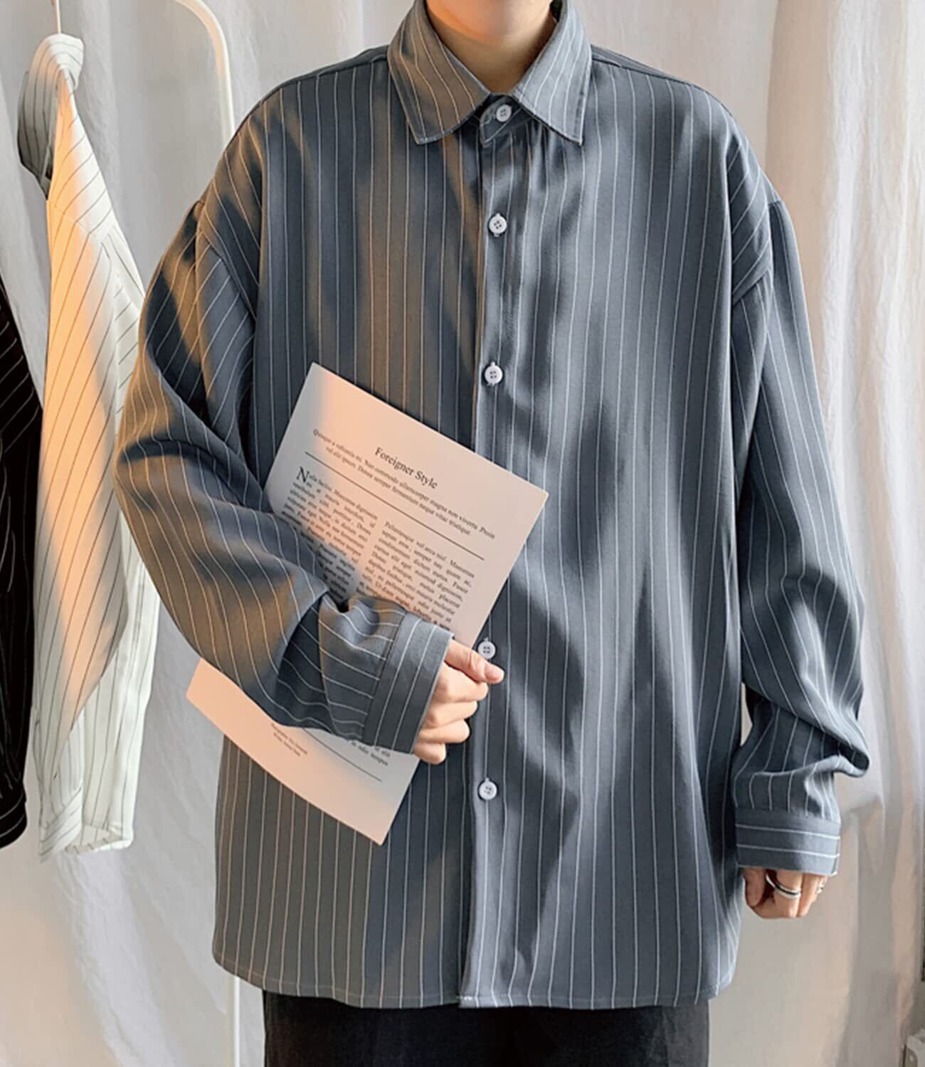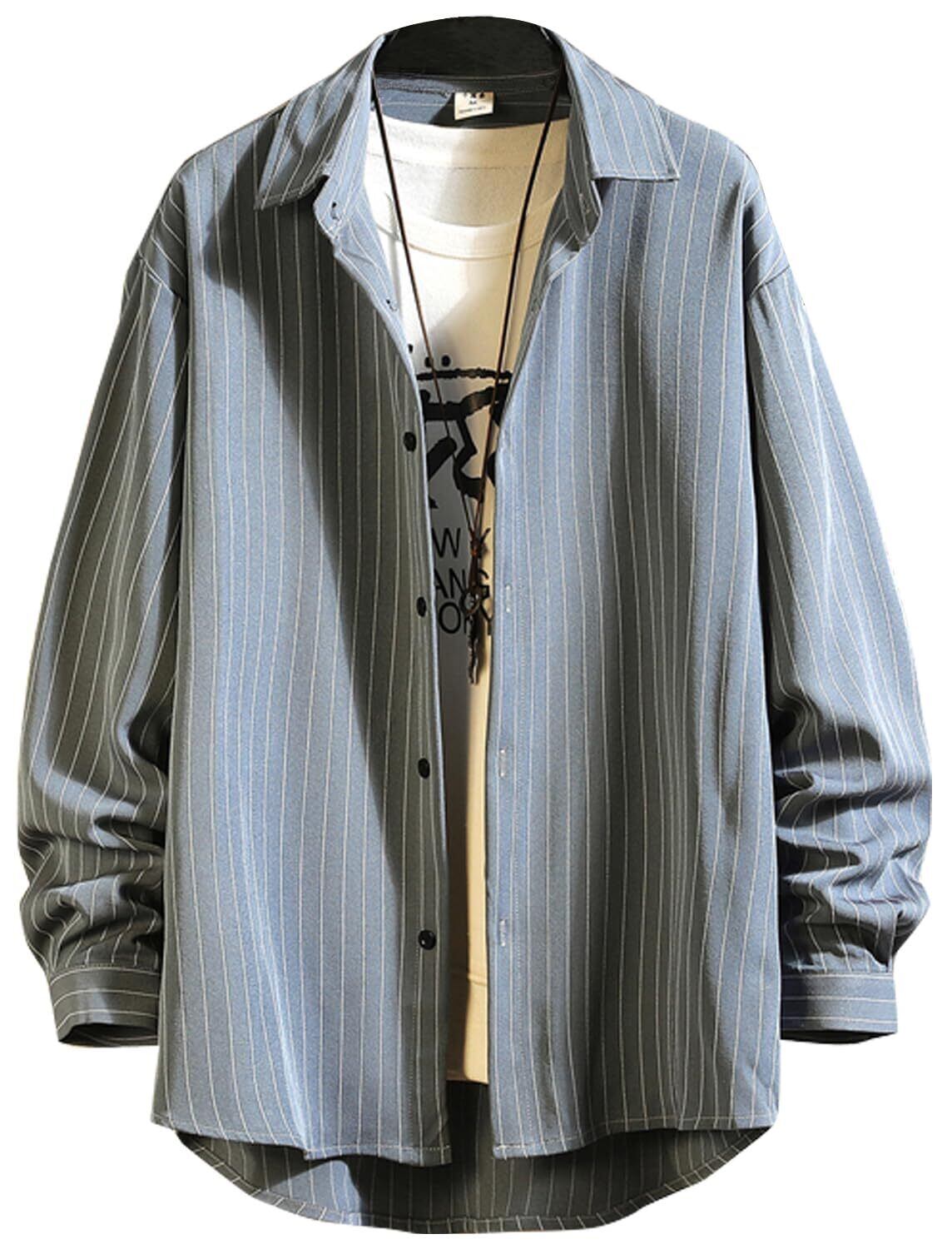 [Amazon 限定ブランド]シャツ メンズ 長袖 ワイシャツ ストライプ柄 ボタンダウン L-5XL 春 秋服 ゆったり カジュアル 大きいサイズ 柔らかい シンプル おしゃれ ドロップ ショルダー 薄手 ブラウス フィット 良品生地 Gray-5XL