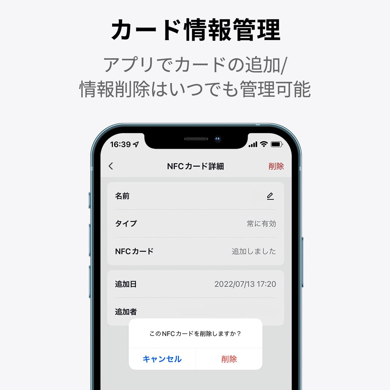【カードの管理も簡単】専用のアプリでカードの追加/情報削除はいつでも簡単に管理できます。カードを失くしてしまった際は、スマホのアプリからカード情報の削除ができます。同様に、失くしたカードが見つかった際は、再登録も可能です。(※カード情報削除は、キーパッド/指紋認証パッドがBluetoothに接続している必要があります。)