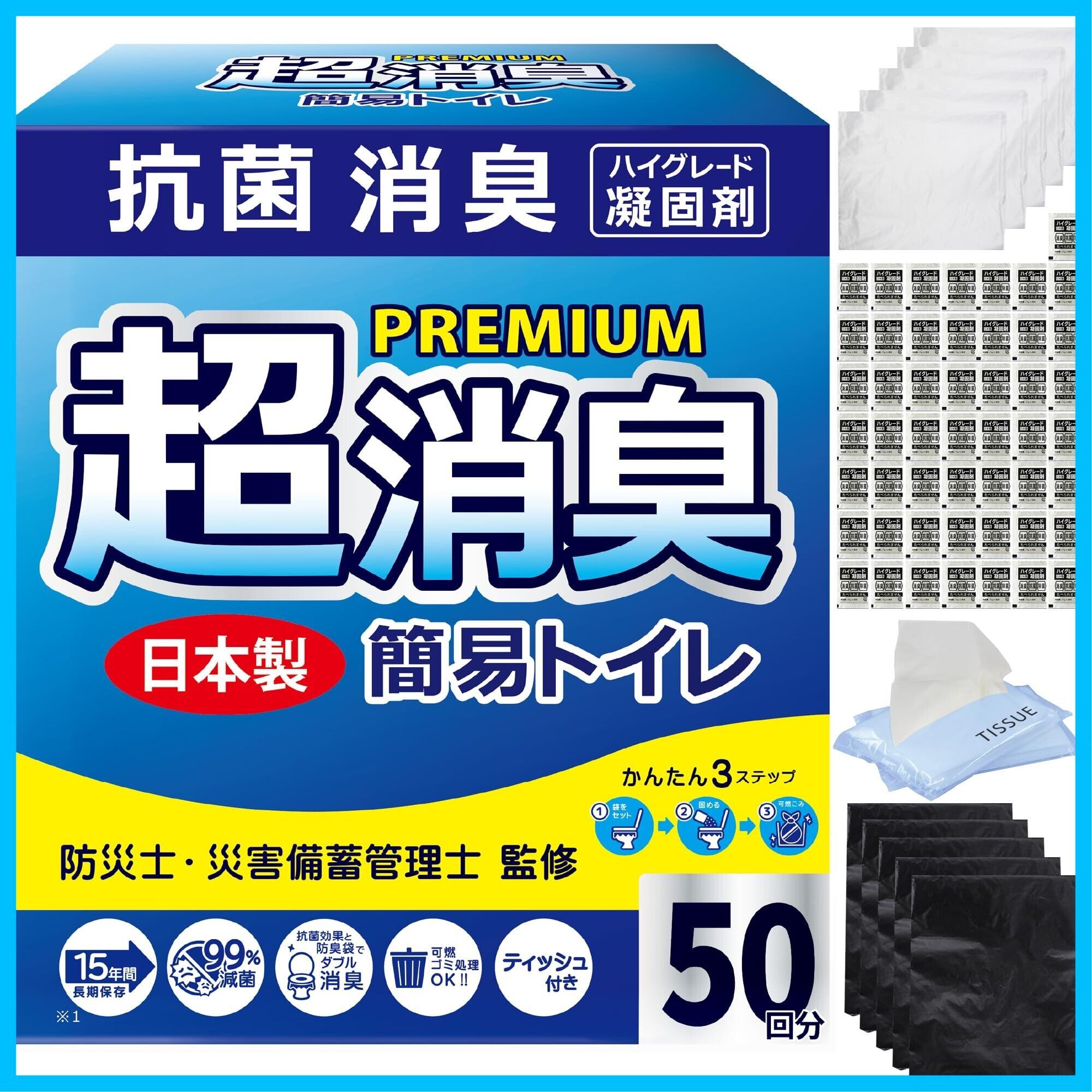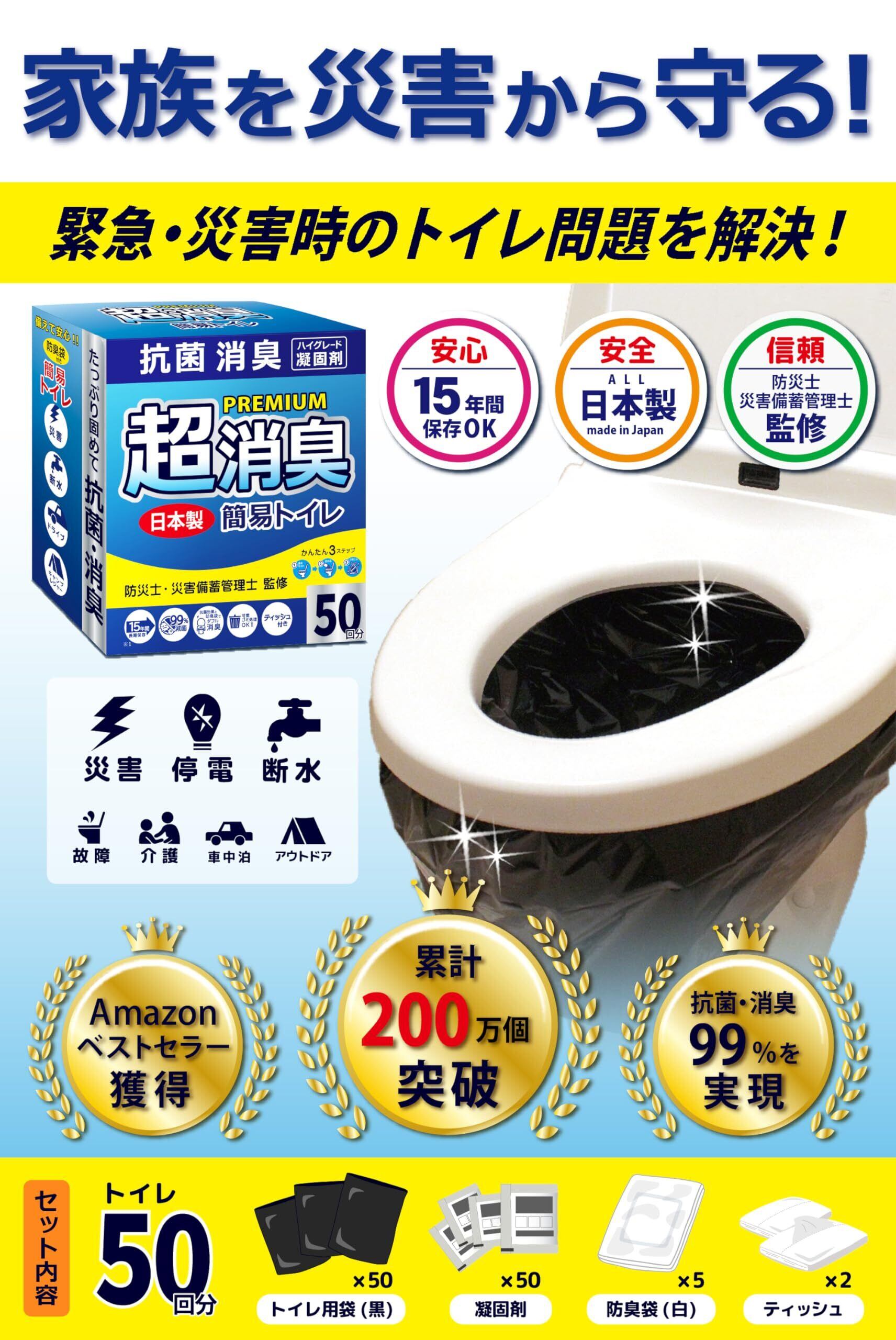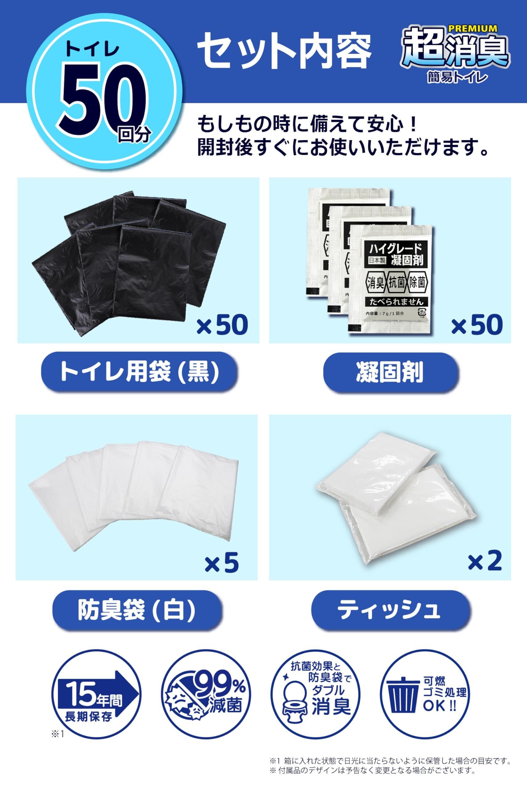 【15年長期保存可能!備蓄で安心!】ラインアップは15回・30回・50回・100回用の4タイプ。国産製造で安心の品質に加え、簡易トイレは15年間の長期保存が可能なのも嬉しいポイント!15年後も変わらない吸収力で非常時も困りません。簡易トイレ、携帯トイレ、災害用トイレ、仮設トイレとしてご家庭はもちろん企業や自治体でも備蓄しておくと安心です。(梱包物:黒色トイレ用袋×50枚、凝固剤×50個、取扱説明書×1枚)※アイテムのデザイン、パッケージは予告なく変更する場合が御座います。予めご了承ください。