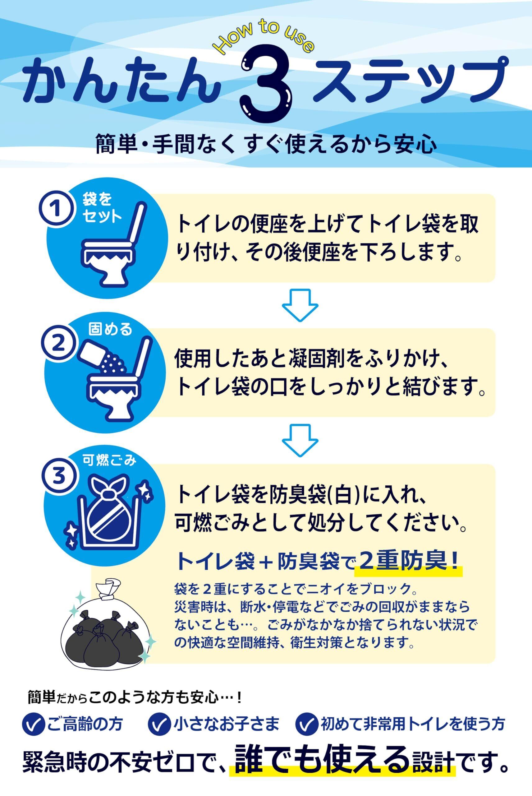 【国産100%!しっかり固まります!】災害大国だからこそ、急なトラブルでも問題なく安心してお使い頂けるよう、オール日本製にこだわりました。非常時に役立つ簡易トイレです。国産の凝固剤なので、水なしですぐに固まります。地震・台風・豪雨といった自然災害や、事故による断水・水不足によってトイレが自由に使えなくなるなどの防災用携帯トイレとしても。さらに、キャンプや登山などのアウトドアで近くに水場がない状況に携帯トイレとしても大活躍します!