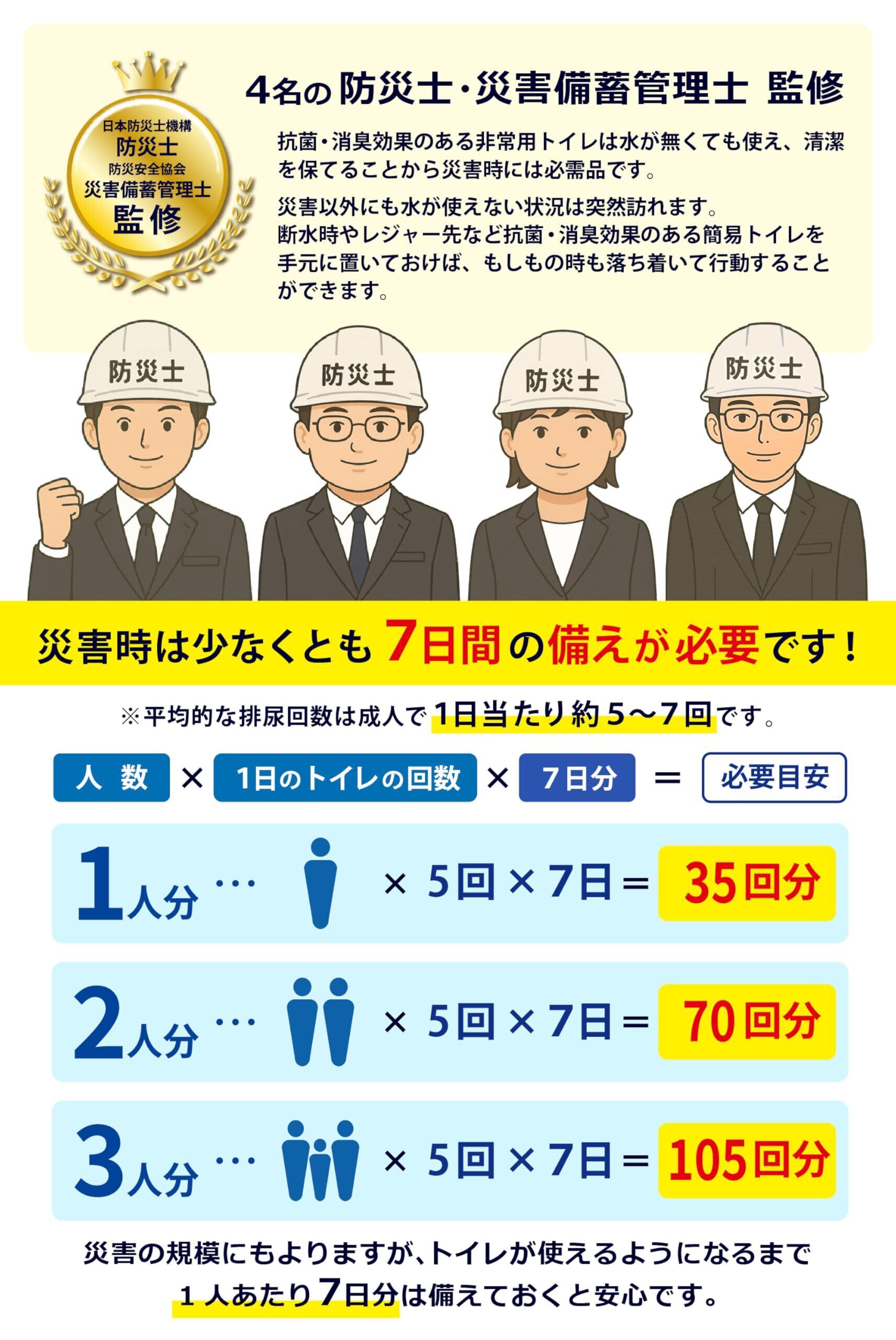 【防災士監修のこだわり】阪神淡路大震災を経験した防災士が監修。災害時に感じたトイレの不安や悩みを元に製品開発に取り組んだこだわりのある簡易トイレです。簡易トイレに求められる菌の抑制・消臭に力を注ぎ、不安要素をなくしていただけるよう開発しました。ライフラインが停止した時も、菌の繁殖を抑え、感染症の危険からも守ります。こだわりの独自開発された防災トイレは防災時の必需品としてあなたの家族を守ります。