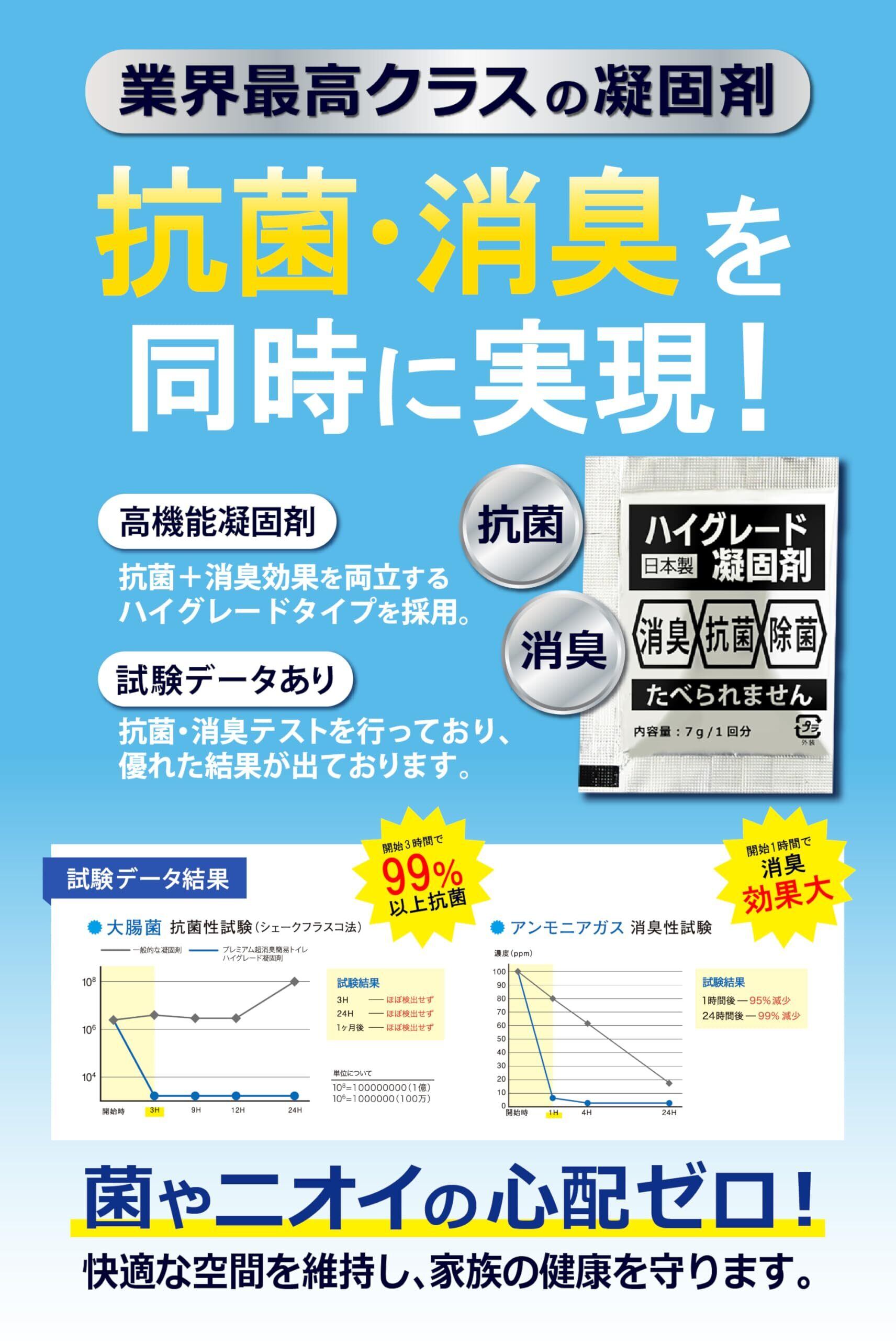 【減菌99%、24時間後には臭いゼロ!】臭いを心配される方は多いはず....。『トイレの達人』は日本の厳しい試験をクリアしたトップクラスの消臭力を誇る携帯トイレです。消臭性は24時間でほぼ0%に。スピーディに固まる高品質なハイグレード凝固剤とセットで使うことで抜群の消臭力を実現!周りに迷惑や不快感を与えません。