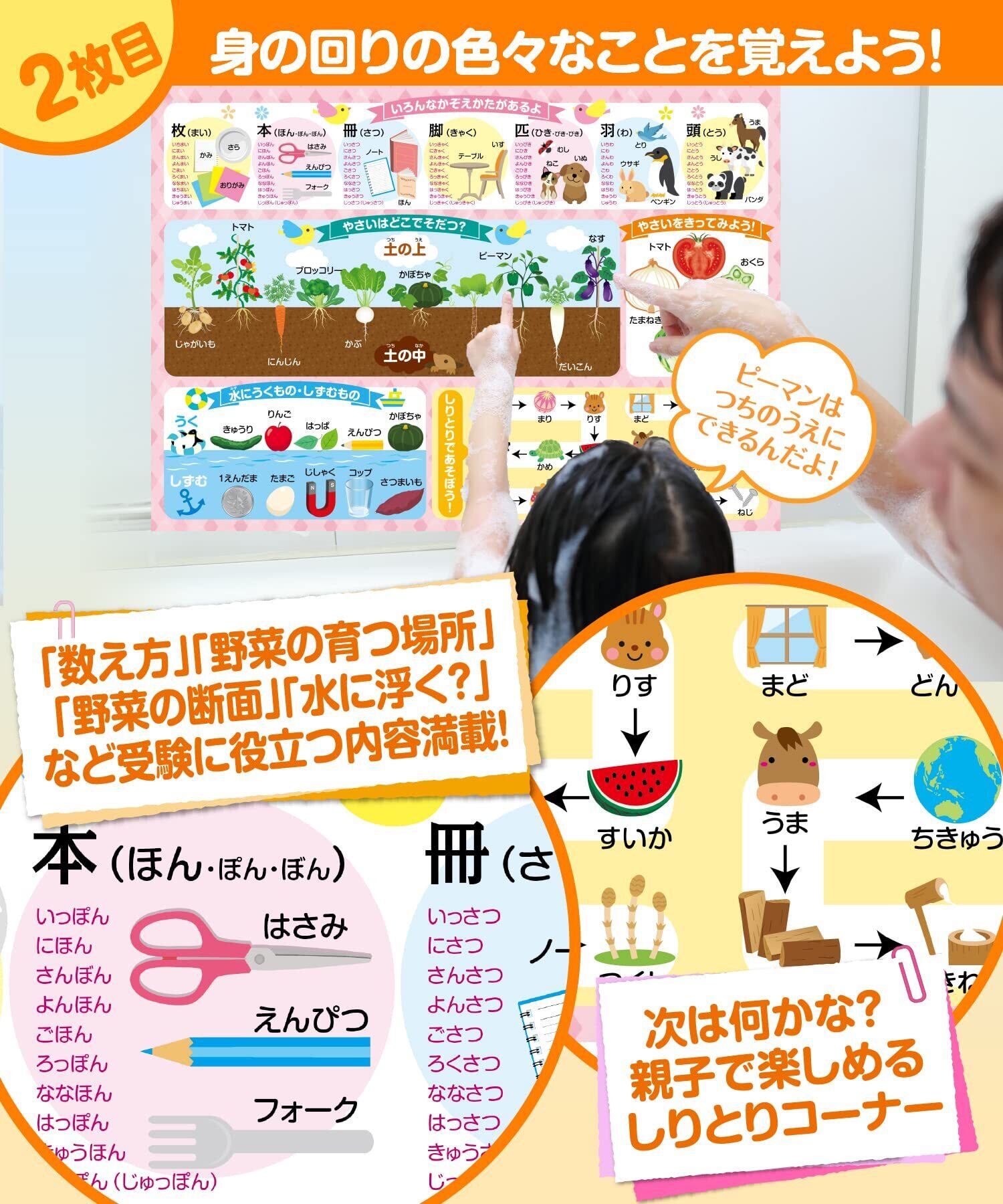 お風呂の学校 小学校 お受験対策 知育 学習 お風呂ポスター 3枚セット 日本製(季節の花・食べ物・行事・ものの数え方・二十四節気・マナー違反などを網羅) 小学校受験 B3サイズ 防水