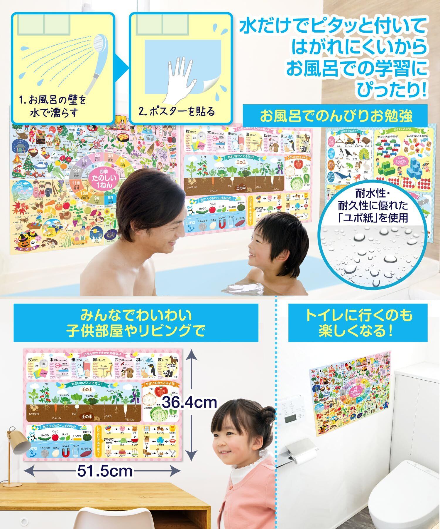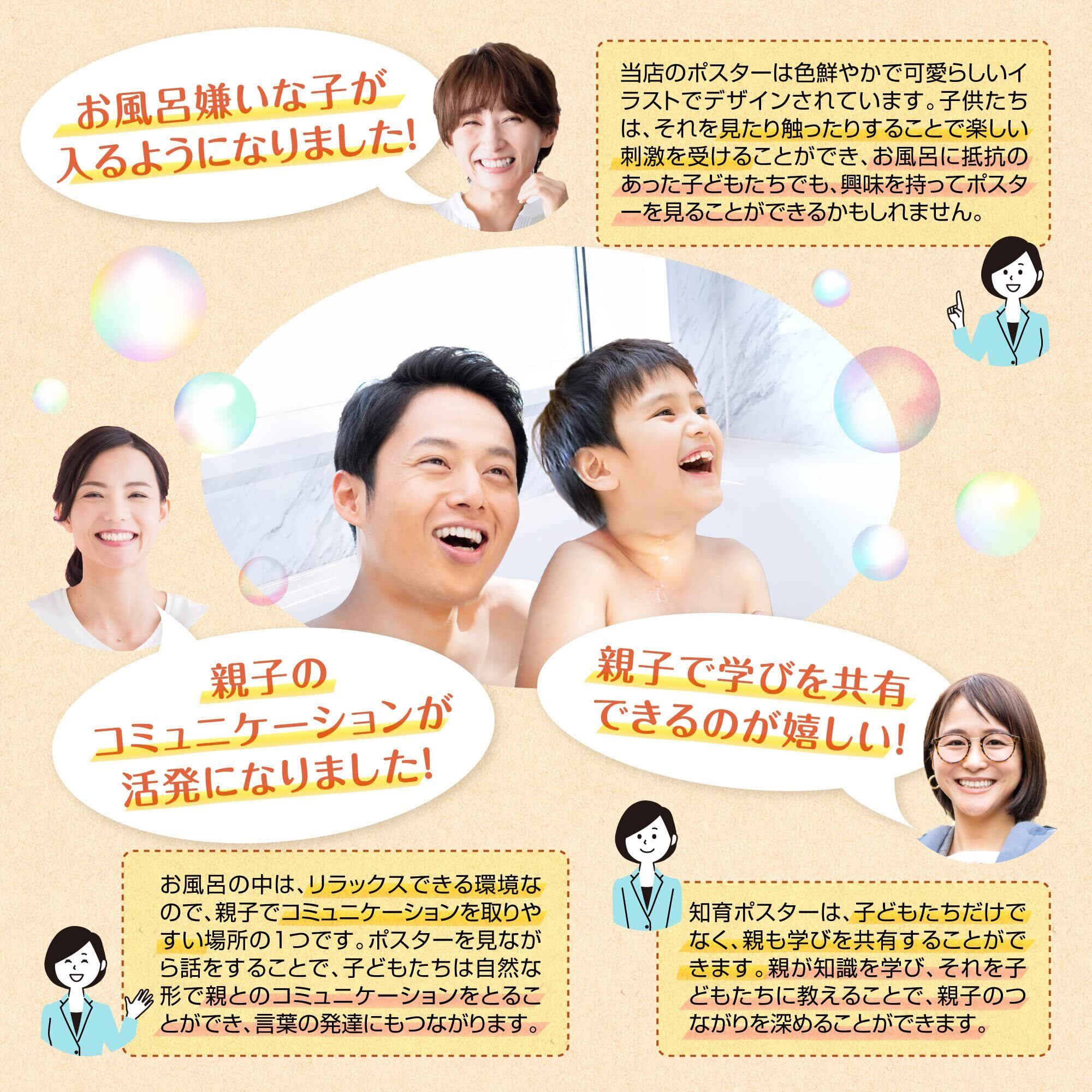 【耐水性と防水性に優れた素材】 ポスターは薄くて丈夫なスーパーユポ紙を使用しており、耐水性と防水性に優れています。これにより、お風呂場でも安心して使用できるため、お風呂タイムを楽しい学びの時間に変えることができます。水に強い素材なので、長期間使用しても劣化しにくいです。