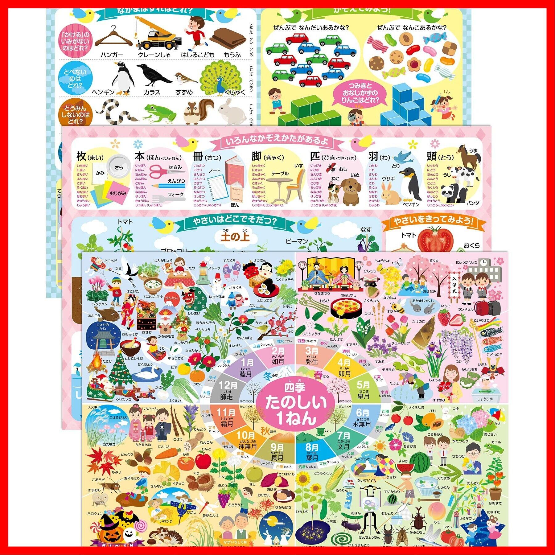 【カラフルで魅力的なデザイン】 ポスター全体が非常にカラフルで、子供たちが興味を持ちやすいように工夫されています。季節ごとのイベントや風物詩が鮮やかなイラストで描かれており、一目で内容が分かるようになっています。視覚的な楽しさがあり、学習への興味を引き出します。