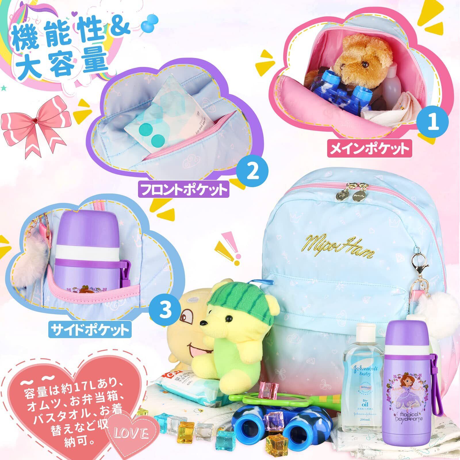 容量は約17Lあり、お弁当、着替え、宿題、筆箱、絵本、800mlの水筒など収納可。 丈夫で長持ちするので入学、通学、学習塾、部活、登山、普段使いもアウトドアでも使用できるシンプルでかわいい人気のバックパックです。
