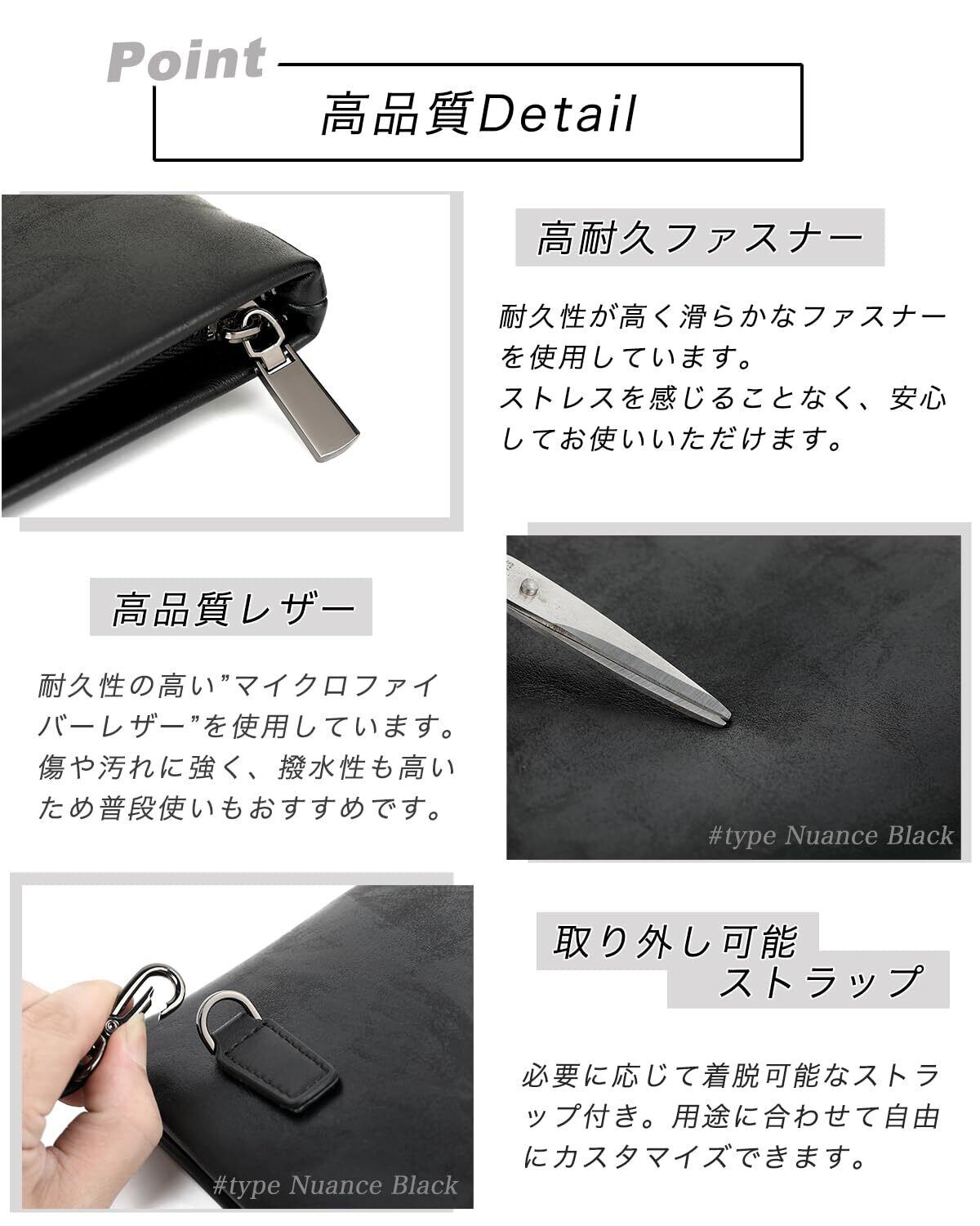【本革以上の使い心地を】傷や汚れに強く、本革のようなしっとりした手触りを実現した”マイクロファイバーレザー”を使用し、より使いやすくおしゃれなクラッチバッグ。滑らかなブラックのファスナーと品の良いデザインで普段使いから冠婚葬祭、フォーマルまで幅広くお持ちいただけます。【生地感】(#01チェック)凹凸感あり。フォーマルよりで高級感があります。(#02ライン)スタイリッシュなデザイン。カジュアルにもフォーマルにもお使いいただけます。(#03幾何学)凹凸感あり。光の加減によってキラキラと反射しますのでパーティなど華やかな場により最適です。(#04マット)シンプル。しっとりした肌触りのよい質感でフォーマルにもカジュアルにも合います。(#サフィアーノ)硬めの質感で高級感があります。本革に似た質感でよりフォーマルな雰囲気に似合います。(#ニュアンス)光の加減で革の傷っぽい模様が浮かび上がります。他にはないお洒落な雰囲気です。