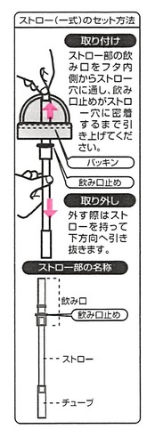 素材・材質:フタ・本体=ポリプロピレン、フタカバー=ABS樹脂、ストロー=ポリエチレン、パッキン・飲み口チューブ=シリコーンゴム