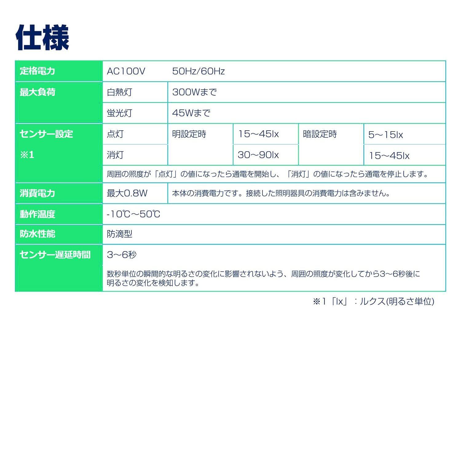 ●周囲が暗くなると自動で電源が入り、明るくなれば自動で電源が切れますので、イルミネーションや庭園灯・防犯灯・外灯につなぐことで、簡単に夜間連続点灯器具として使用できます。 ●耐トラッキングカバー付プラグを採用していますので、電気火災を予防できます。