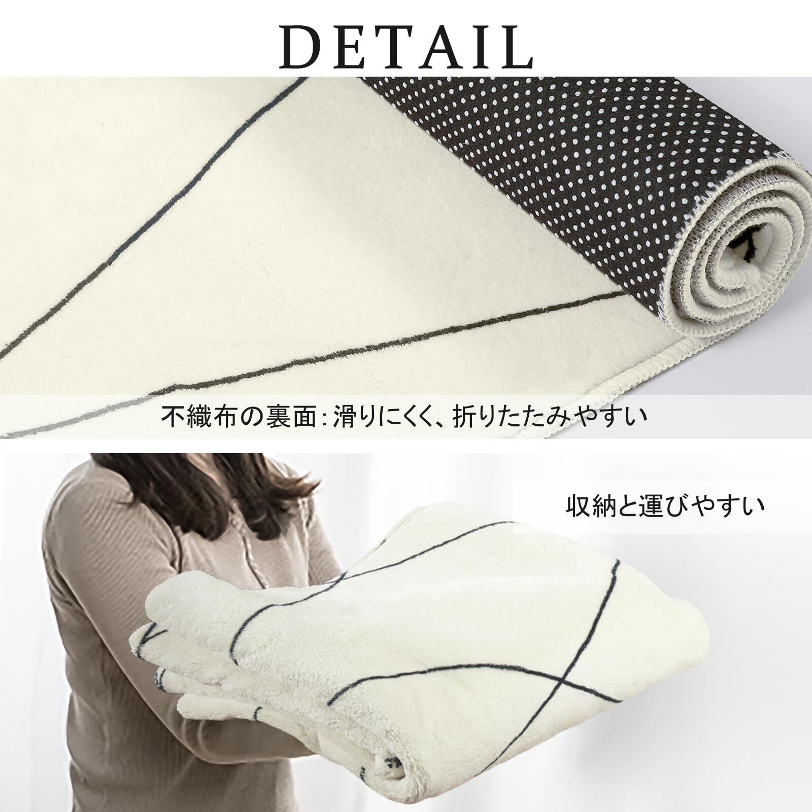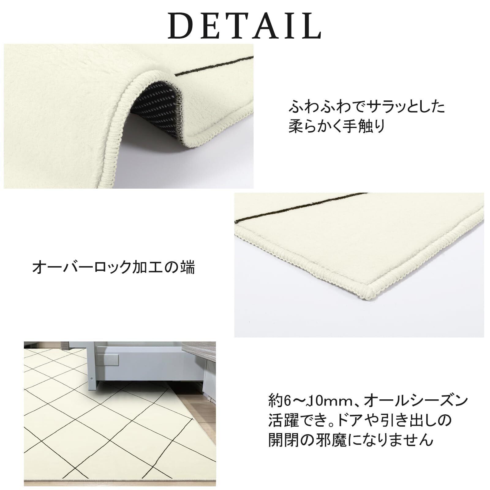 【商品仕様】サイズ:90x150cm、厚さ:約6~10mm、表面素材:100%ポリエステル。裏面素材:不織布(滑り止め加工)。オーバーロック加工の端、遊び毛が出たり、形を崩れたりしにくい。梱包:折り畳み。※裏面に滑り止め加工を施しているため、床暖房の上に直接敷くのはおすすめできません