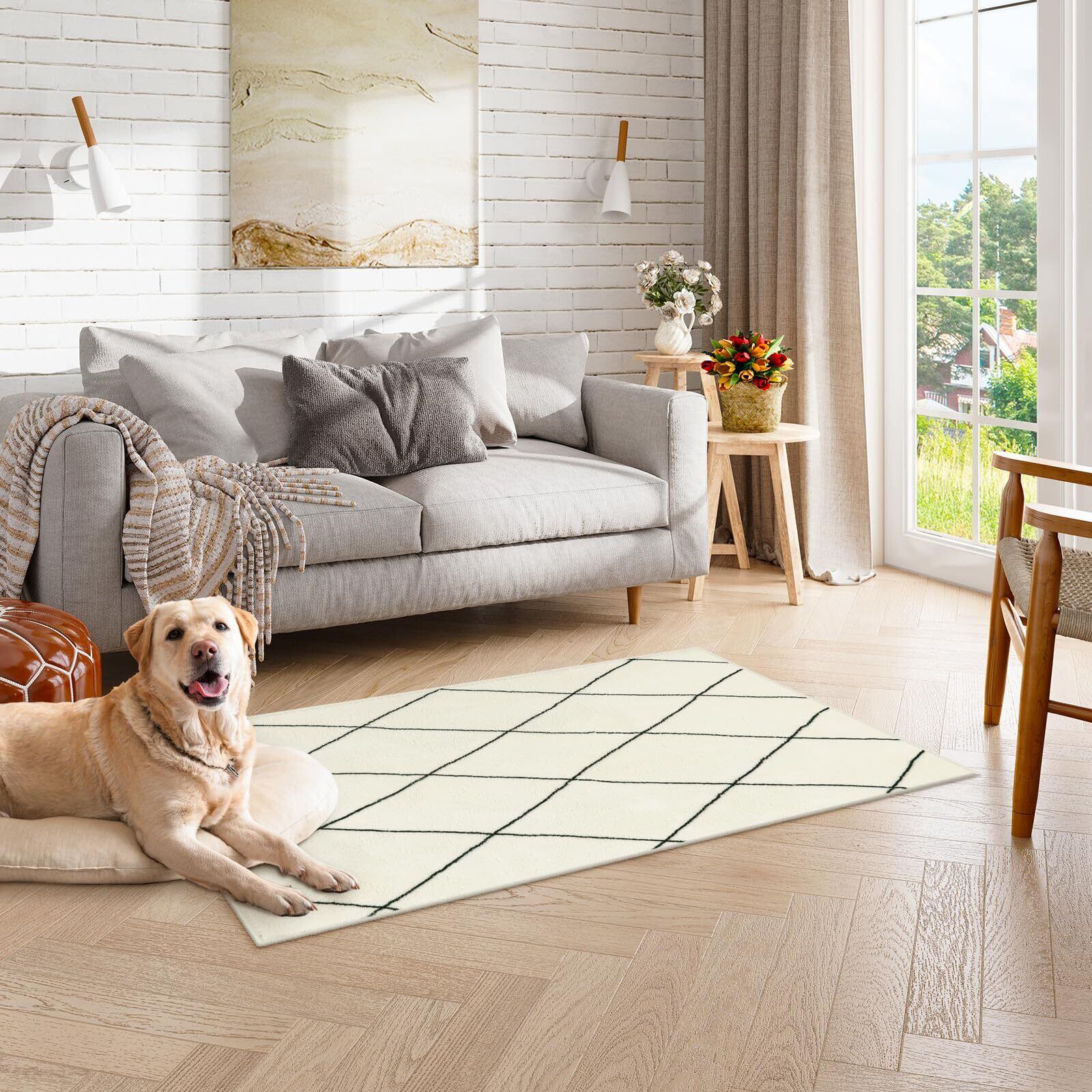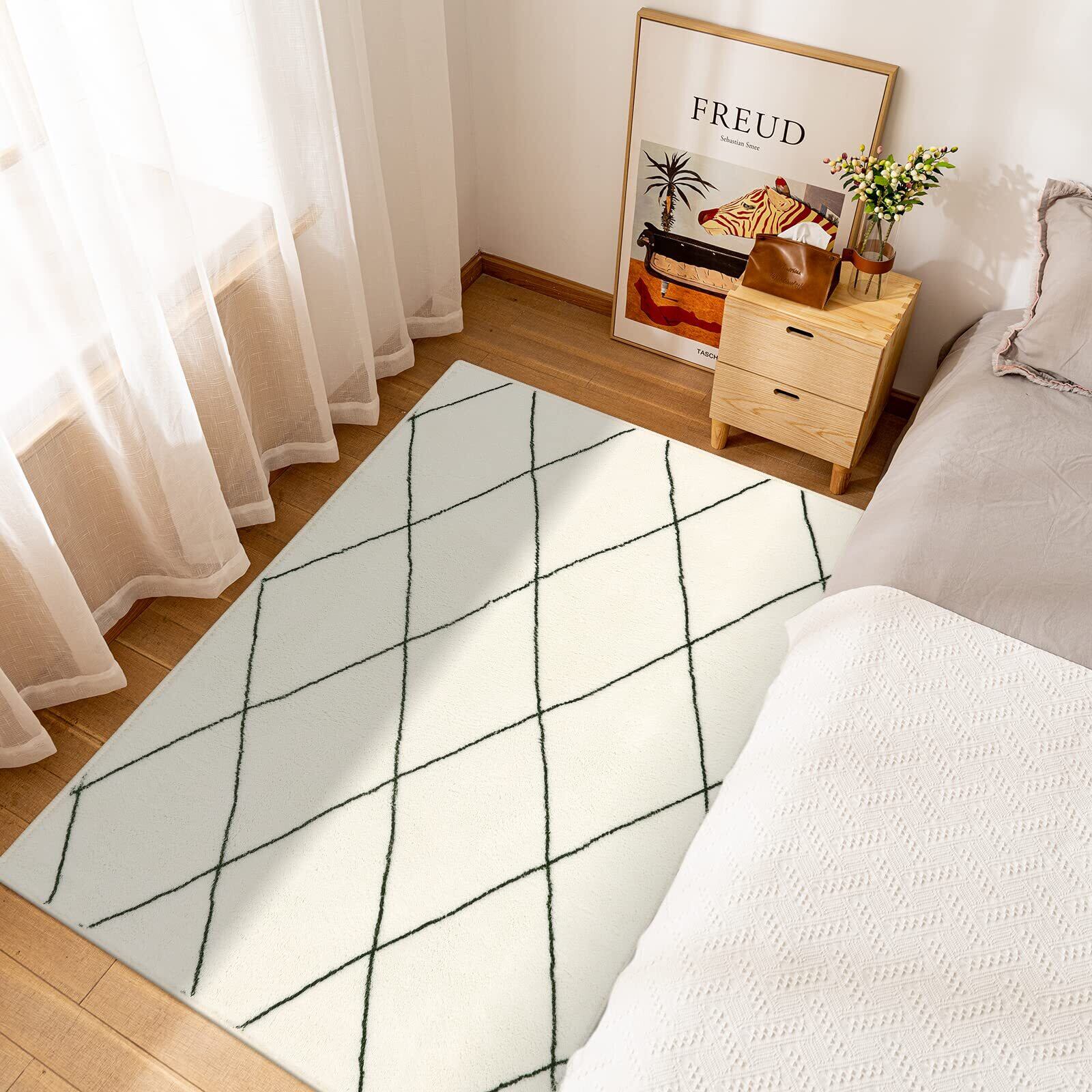 【北欧風の幾何学柄】シンプルで自然な線から描かれた幾何学模様、繊細なデザイン画を最新の印刷技術でふわふわの人工ウール生地にプリント、馴染みやすいホワイトとベニワレン風のデザインはお部屋のアクセントとしてもおすすめ