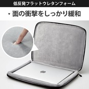 側面を360度保護するコーナーガードクッションと、天面、底面それぞれに内蔵された低反発ウレタンフォーム、機器表面を傷つけない内側の優しい起毛生地によって、収納物を徹底的に保護します。撥水加工を施した落ち着いた風合いの生地を採用したシンプルなデザイン。保護性能とスリムを両立させたインナーケースです。