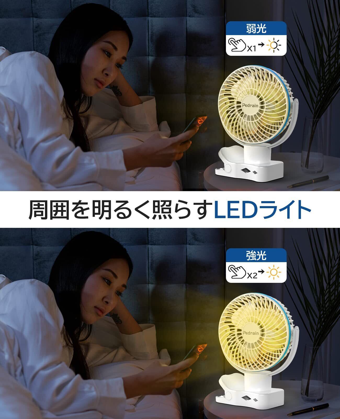 【リモコン付き・タイマー機能・LEDライト】リモコン付きで超便利!全ての操作をリモコンでも行えますので、離れた場所から遠隔操作ができます。電源ON/OFF、自動首振り、風量モート切替り、タイマー機能0.5h/1h/1.5h/2h、LEDライト切替りなどリモコン操作ができるので、お部屋でくつろいいだまま快適に過ごせます。弱・強の2段階で明るさが調整できるナイトライト機能付きで、明かりは柔らかくて目を保護します。アウトドアや地震、台風の停電時も困らず、安心感いっぱい!