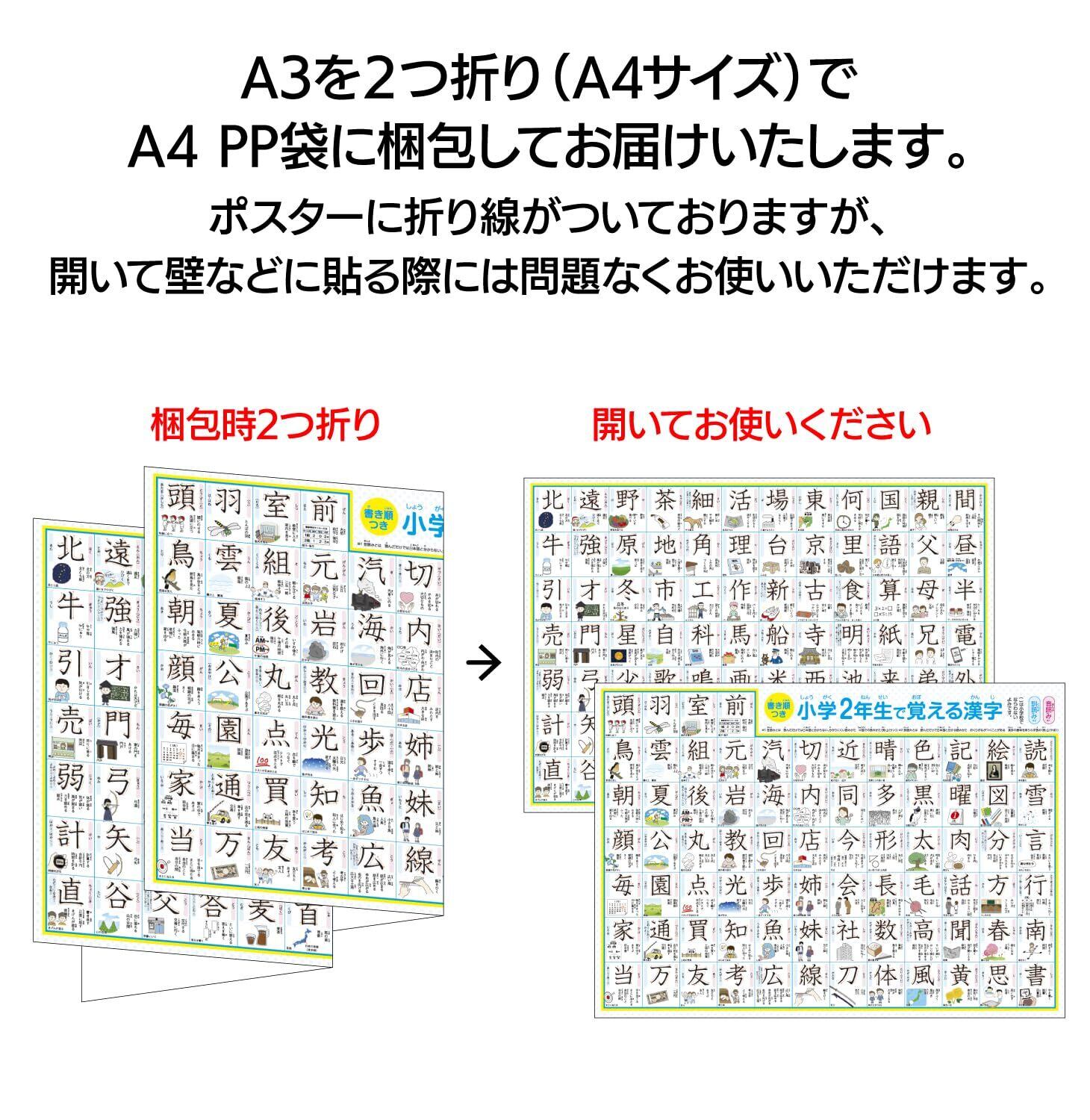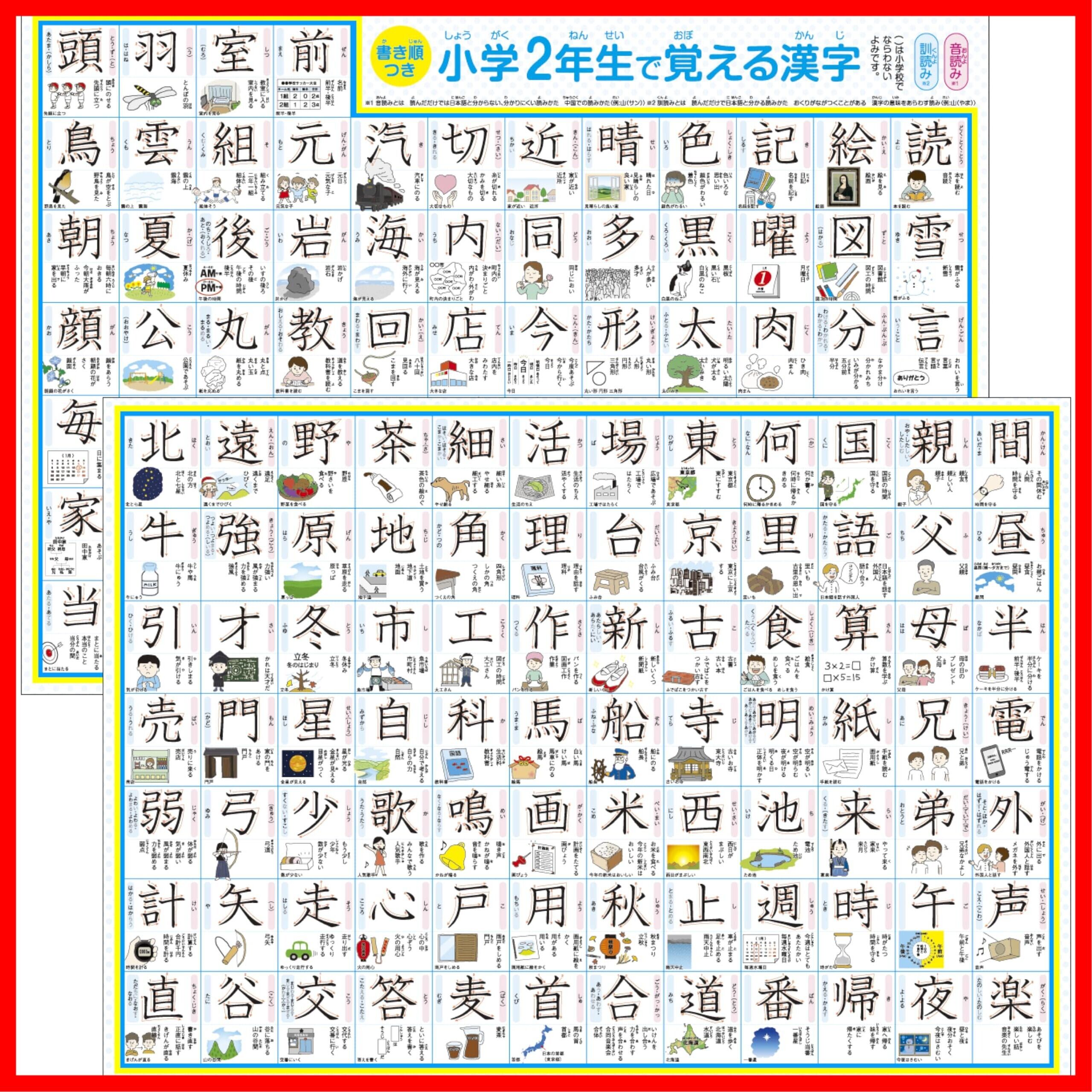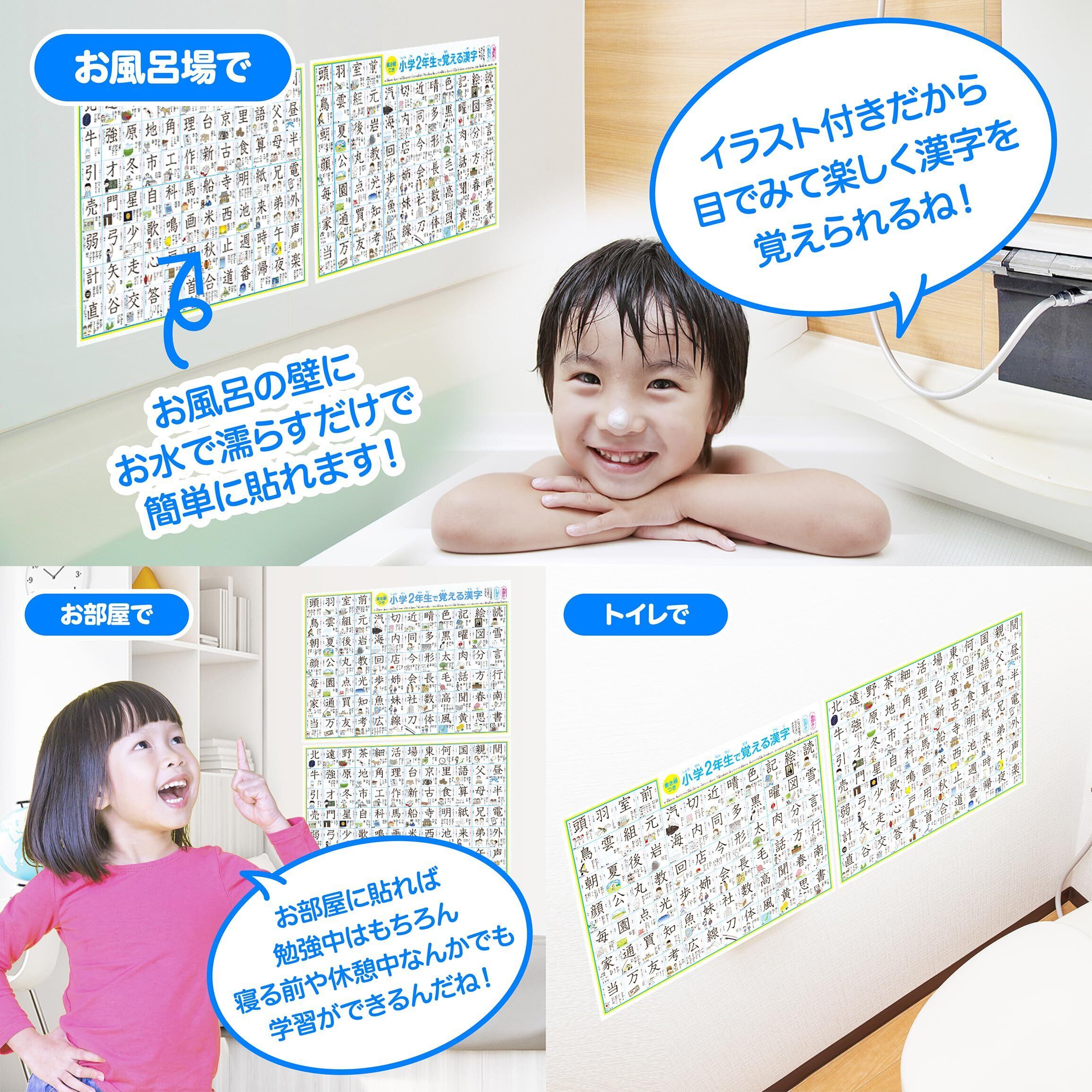 どこでも学習館 小学二年生で習う漢字表 お風呂ポスター 2年生 A3ユポ紙 2枚 書き順・使用例・イラスト付き 防水