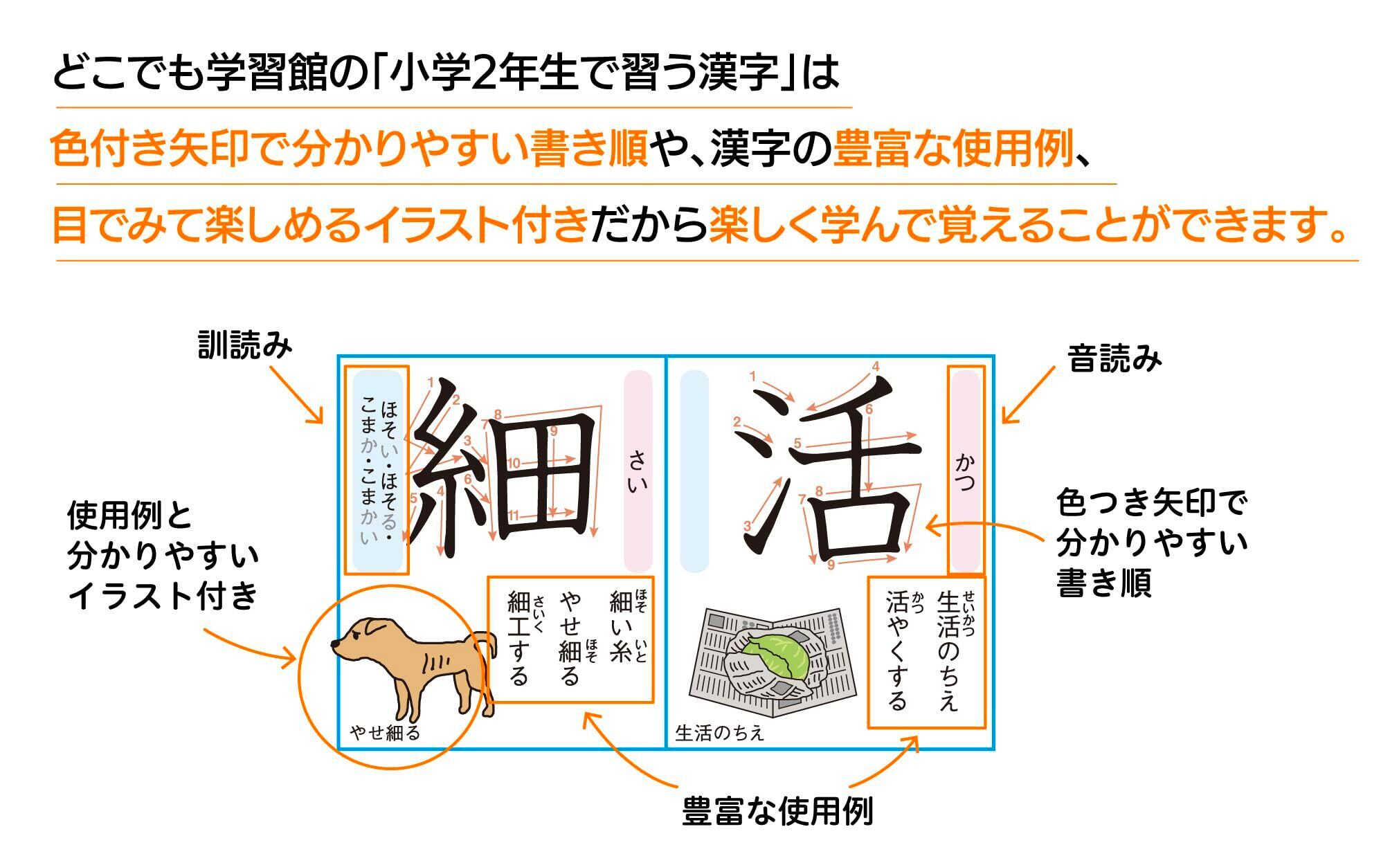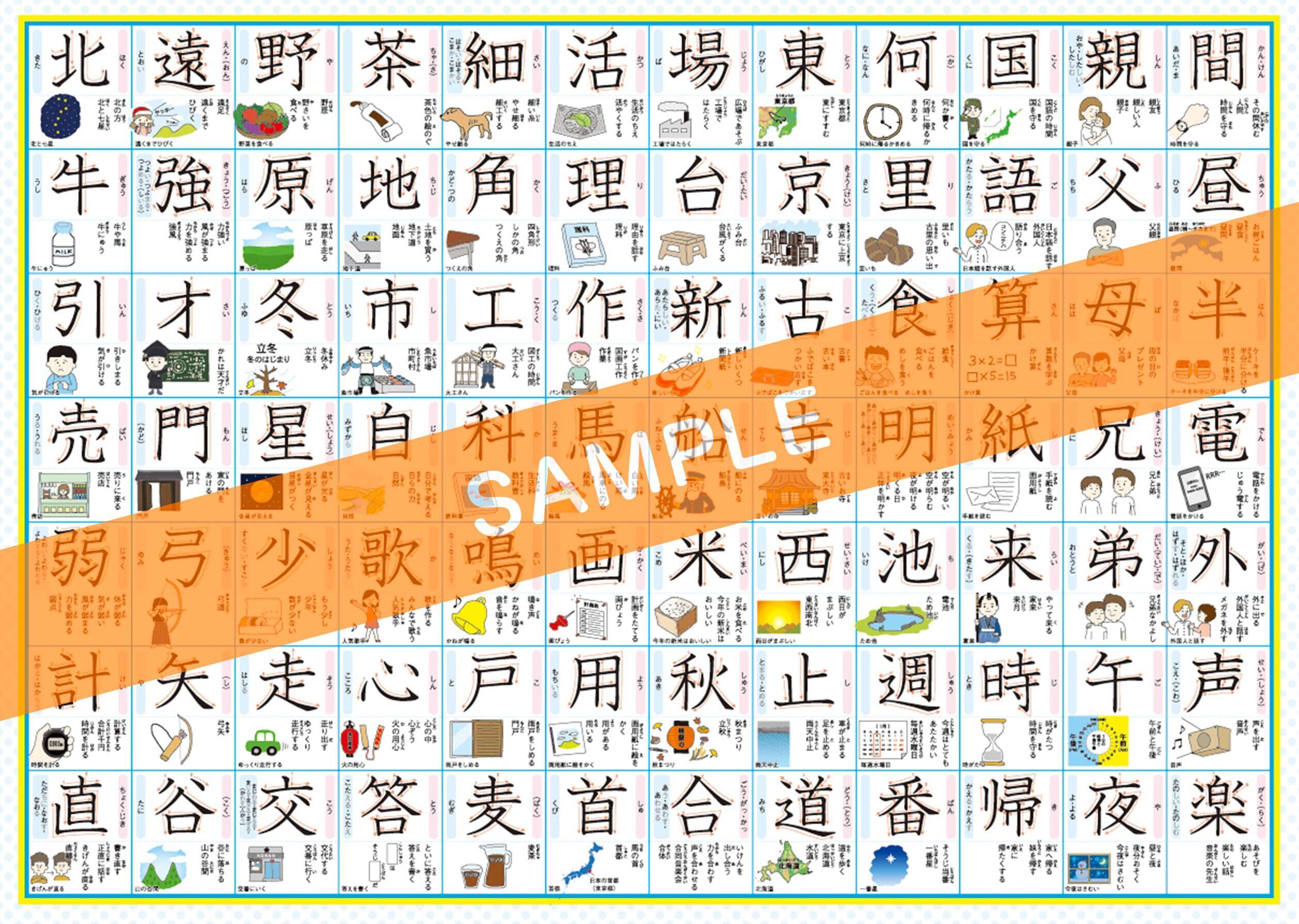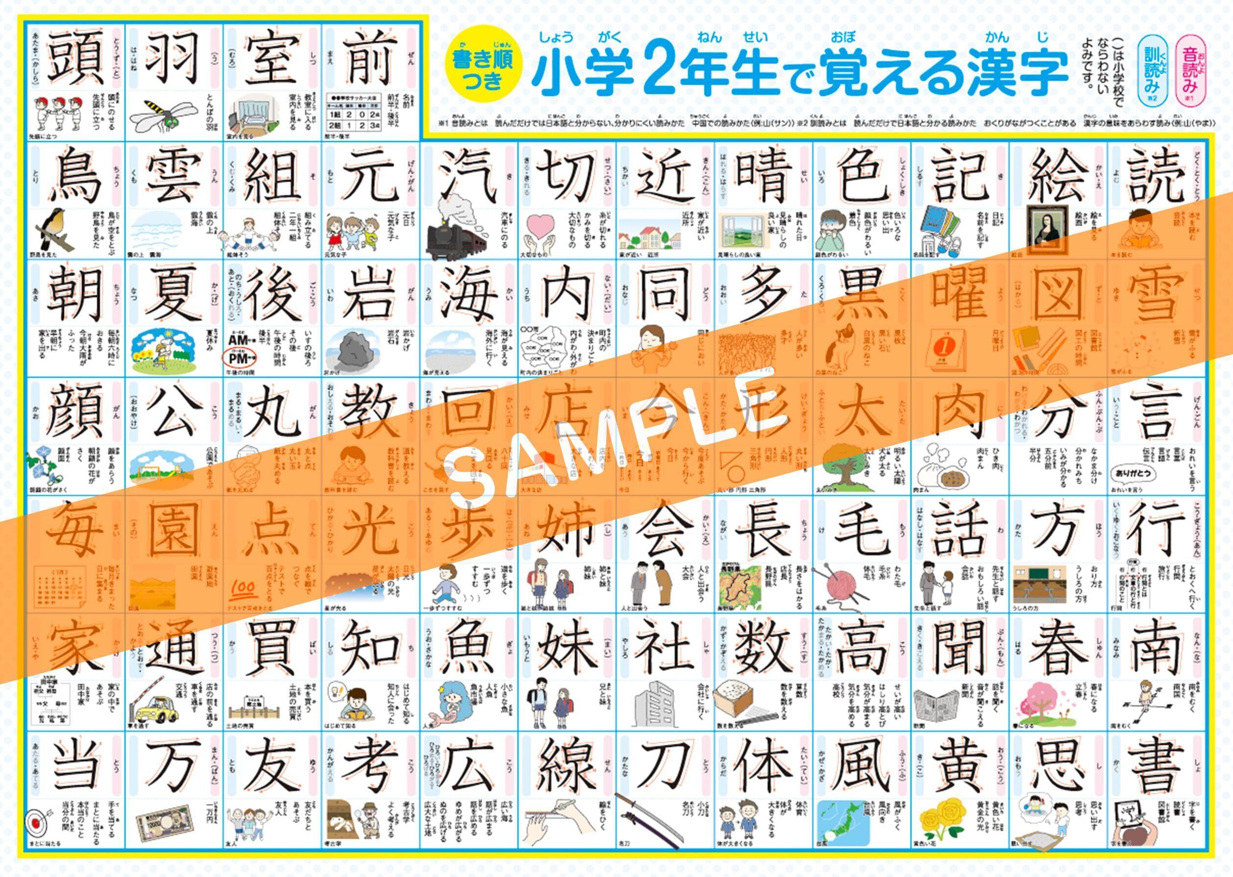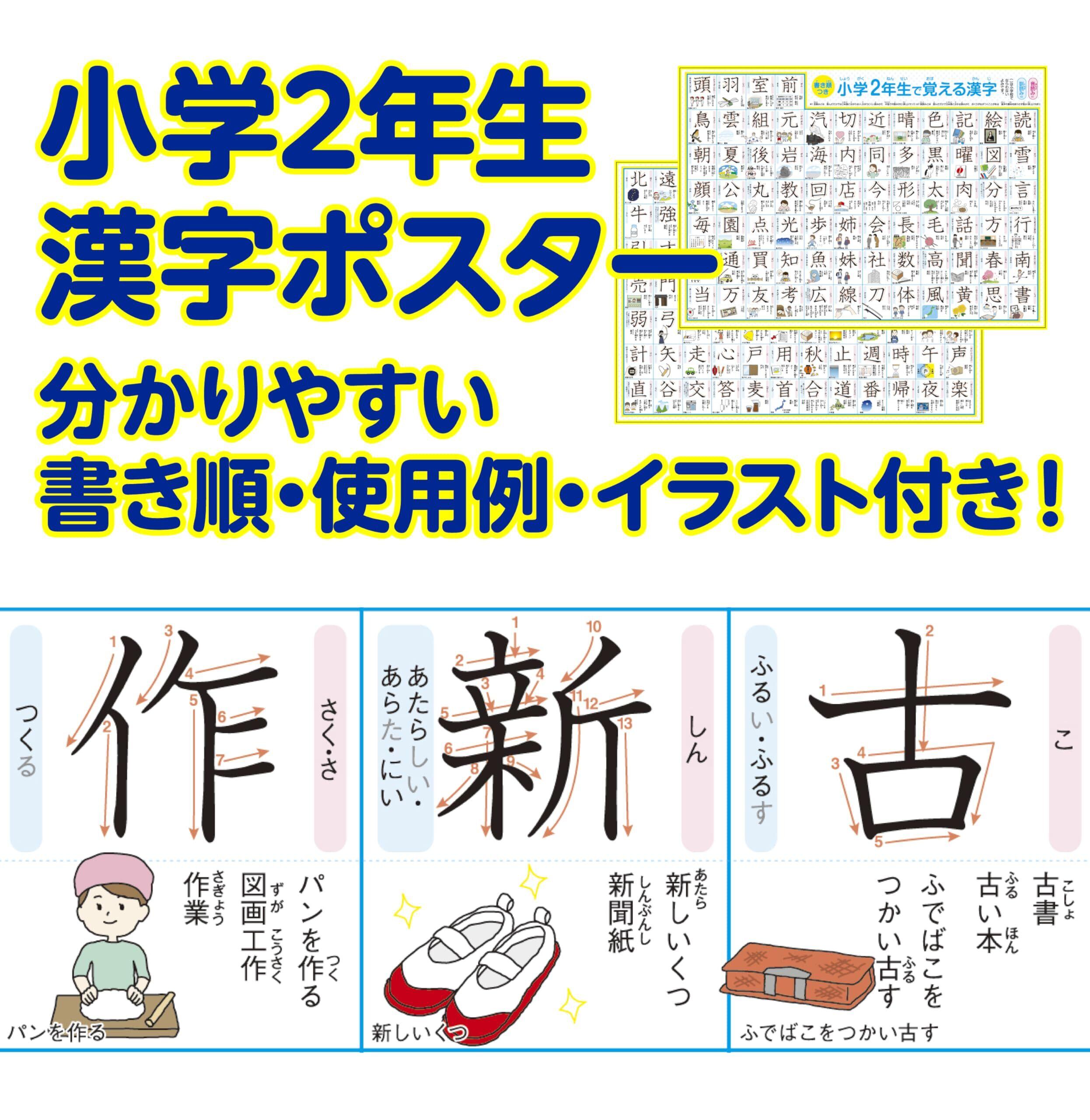 どこでも学習館 小学二年生で習う漢字表 お風呂ポスター 2年生 A3ユポ紙 2枚 書き順・使用例・イラスト付き 防水